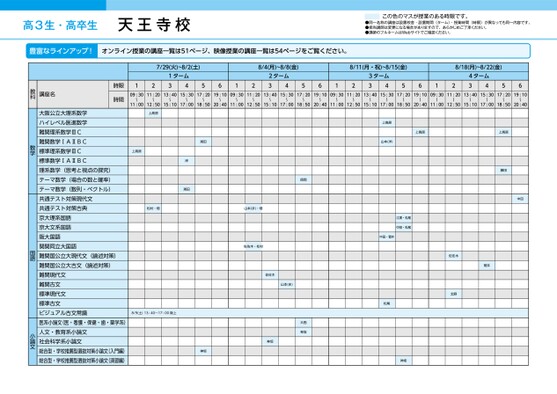 高3生・高卒生天王寺校この色のマスが授業のある時限です。●同一名称の講座は設置校舎・設置期間(ターム)・授業時間(時限)が異なっても同一内容です。●担当講師は変更になる場合がありますので、あらかじめご了承ください。●講師のフルネームはWebサイトでご確認ください。豊富なラインアップ!オンライン授業の講座一覧は51ページ、映像授業の講座一覧は54ページをご覧ください。7/29(火)~8/2(土)ムータ143125612(4/8月)~8/8(金)ムータ2438/11(月・祝)~8/15(金)8/18(月)~8/22(金)5612ムータ3435612ムータ4435617:2019:1009:3011:2013:4015:3017:2019:1009:3011:2013:4015:3017:2019:1009:3011:2013:4015:3017:2019:1009:3011:2013:4015:3011:0012:5015:1017:0018:5020:4011:0012:5015:1017:0018:5020:4011:0012:5015:1017:0018:5020:4011:0012:5015:1017:0018:5020:40上高原上高原湘田岸湘田畑・村松本山(ま)・畑信岡佐佐木・松村佐佐木山本(ま)大西神坂神坂8/9(土)13:40〜17:00阪上神坂原高上藤田中田菅井佐佐木北野上高原山本(洋)原高上江濵・松尾中田・松尾中田・菅井松尾神坂時限時間講座名教科大阪公立大理系数学ハイレベル医進数学難関理系数学ⅢC難関数学ⅠAⅡBC標準理系数学ⅢC標準数学ⅠAⅡBC理系数学(思考と視点の探究)テーマ数学(場合の数と確率)テーマ数学(数列・ベクトル)共通テスト対策現代文共通テスト対策古典京大理系国語京大文系国語阪大国語関関同立大国語難関国公立大現代文(論述対策)難関国公立大古文(論述対策)難関現代文難関古文標準現代文標準古文ビジュアル古文常識医系小論文(医・看護・保健・歯・薬学系)人文・教育系小論文社会科学系小論文総合型・学校推薦型選抜対策小論文(入門編)総合型・学校推薦型選抜対策小論文(演習編)数学国語小論文