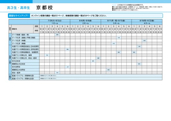 高3生・高卒生京都校この色のマスが授業のある時限です。●同一名称の講座は設置校舎・設置期間(ターム)・授業時間(時限)が異なっても同一内容です。●担当講師は変更になる場合がありますので、あらかじめご了承ください。●講師のフルネームはWebサイトでご確認ください。豊富なラインアップ!オンライン授業の講座一覧は51ページ、映像授業の講座一覧は54ページをご覧ください。7/29(火)~8/2(土)ムータ143125612(4/8月)~8/8(金)ムータ2438/11(月・祝)~8/15(金)8/18(月)~8/22(金)5612ムータ3435612ムータ4435617:2019:1009:3011:2013:4015:3017:2019:1009:3011:2013:4015:3017:2019:1009:3011:2013:4015:3017:2019:1009:3011:2013:4015:3011:0012:5015:1017:0018:5020:4011:0012:5015:1017:0018:5020:4011:0012:5015:1017:0018:5020:4011:0012:5015:1017:0018:5020:40瀧澤竹村竹村時間割は52ページをご覧ください。時間割は52ページをご覧ください。澤田上住小松小松松高松高本瀬小倉高木後藤横内前田講座名時限時間テーマ物理(磁気・熱)テーマ化学(速度と平衡)[発展]テーマ化学(有機)テーマ化学(無機)共通テスト対策歴史総合,日本史探究共通テスト対策歴史総合,世界史探究共通テスト対策地理総合,地理探究共通テスト対策公共,倫理共通テスト対策公共,政治・経済京大日本史関関同立大日本史京大世界史関関同立大世界史政治・経済医進トライアル(英数物化型)医進トライアル(英数化生型)教科理科地歴・公民総合