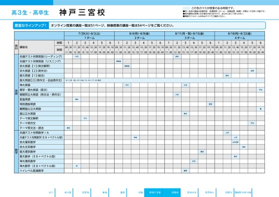●2025年度/夏期講習/近畿/京都/高3・卒生/パターン34602025_56_5_531_11_20250319154534.csv/3ページ高3生・高卒生神戸三宮校校了時削除この色のマスが授業のある時限です。●同一名称の講座は設置校舎・設置期間(ターム)・授業時間(時限)が異なっても同一内容です。●担当講師は変更になる場合がありますので、あらかじめご了承ください。●講師のフルネームはWebサイトでご確認ください。7/29(火)~8/2(土)ムータ143125612(4/8月)~8/8(金)ムータ2438/11(月・祝)~8/15(金)8/18(月)~8/22(金)5612ムータ3435612ムータ44309:3011:2013:4015:3017:2019:1009:3011:2013:4015:3017:2019:1009:3011:2013:4015:3017:2019:1009:3011:2013:4015:305617:2019:1011:0012:5015:1017:0018:5020:4011:0012:5015:1017:0018:5020:4011:0012:5015:1017:0018:5020:4011:0012:5015:1017:0018:5020:40千代8/11(月・祝)〜8/13(水)15:30〜17:00西内胡摩﨑胡摩﨑千代島田千代清水岸寺尾西内久末久末清水藤野佐野戸谷戸谷慎堂前西内上村上村山本(敏)涌谷涌谷藤田木村時限時間講座名教科共通テスト対策英語(リーディング)共通テスト対策英語(リスニング)京大英語【1】英文解釈)京大英語【2】英作文)阪大英語【1】総合)阪大英語【2】英作文・自由英作文)神大英語関学・関大英語(長文)関関同立大英語(英文法・英作文)医進英語特別選抜英語難関国公立大英語国公立大英語テーマ英文解釈テーマ英作文テーマ英文法・語法共通テスト対策数学IA共通テスト対策数学(ⅡB+ベクトル型)京大理系数学京大文系数学阪大理系数学阪大数学(ⅡB+ベクトル型)神大理系数学神大数学(ⅡB+ベクトル型)ハイレベル医進数学英語数学豊富なラインアップ!オンライン授業の講座一覧は51ページ、映像授業の講座一覧は54ページをご覧ください。八木西大寺岸和田堺東高槻豊中神戸三宮校京都校天王寺校上本町校大阪校東大・京大・医進館