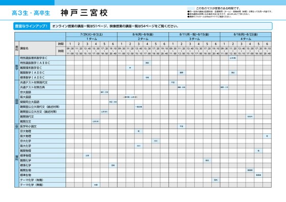 高3生・高卒生神戸三宮校この色のマスが授業のある時限です。●同一名称の講座は設置校舎・設置期間(ターム)・授業時間(時限)が異なっても同一内容です。●担当講師は変更になる場合がありますので、あらかじめご了承ください。●講師のフルネームはWebサイトでご確認ください。豊富なラインアップ!オンライン授業の講座一覧は51ページ、映像授業の講座一覧は54ページをご覧ください。7/29(火)~8/2(土)ムータ143125612(4/8月)~8/8(金)ムータ2438/11(月・祝)~8/15(金)8/18(月)~8/22(金)5612ムータ3435612ムータ4435617:2019:1009:3011:2013:4015:3017:2019:1009:3011:2013:4015:3017:2019:1009:3011:2013:4015:3017:2019:1009:3011:2013:4015:3011:0012:5015:1017:0018:5020:4011:0012:5015:1017:0018:5020:4011:0012:5015:1017:0018:5020:4011:0012:5015:1017:0018:5020:40岸湘田寺尾一番合戦・山本(ま)中田・大村一番合戦畑中・大村山本(ま)山本(ま)乾古川古川野藤平田松永・島瀬平田辻居宮路本瀬山本(敏)谷涌木八・野青佐佐木乾乾野黒美野黒美岡内岡内講座名時限時間特別選抜理系数学ⅢC特別選抜数学ⅠAⅡBC難関理系数学ⅢC難関数学ⅠAⅡBC標準数学ⅠAⅡBC共通テスト対策現代文共通テスト対策古典京大国語阪大国語関関同立大国語難関国公立大現代文(論述対策)難関国公立大古文(論述対策)難関現代文難関古文医学科小論文京大物理阪大物理京大化学阪大化学難関物理標準物理難関化学標準化学難関生物標準生物テーマ化学(有機)テーマ化学(無機)教科数学国語小論文理科