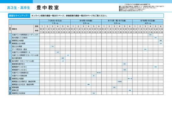 高3生・高卒生豊中教室この色のマスが授業のある時限です。●同一名称の講座は設置校舎・設置期間(ターム)・授業時間(時限)が異なっても同一内容です。●担当講師は変更になる場合がありますので、あらかじめご了承ください。●講師のフルネームはWebサイトでご確認ください。●現役生教室の受講対象は新高3生のみです。豊富なラインアップ!オンライン授業の講座一覧は51ページ、映像授業の講座一覧は54ページをご覧ください。7/29(火)~8/2(土)1ターム431256128/4(月)~8/8(金)2ターム438/11(月・祝)~8/15(金)8/18(月)~8/22(金)56123ターム4356124ターム435609:3011:2013:4015:3018:0019:5009:3011:2013:4015:3018:0019:5009:3011:2013:4015:3018:0019:5009:3011:2013:4015:3018:0019:50〜〜〜〜〜〜〜〜〜〜〜〜〜11:0012:5015:1017:0019:3021:2011:0012:5015:1017:0019:3021:2011:0012:5015:1017:0019:3021:2011:0012:5015:1017:0019:3021:20〜〜〜〜〜〜〜〜〜〜〜下村上村上村数野上村白井白井津留山内白井青木吉田杉原野口(良)堀瀬島木村一番合戦吉田畑中・堀宮路時限時間講座名教科共通テスト対策英語(リーディング)阪大英語【1】総合)関関同立大英語難関国公立大英語国公立大英語テーマ英文法・語法共通テスト対策数学IA共通テスト対策数学(ⅡB+ベクトル型)阪大理系数学阪大数学(ⅡB+ベクトル型)難関理系数学ⅢC難関数学ⅠAⅡBC標準数学ⅠAⅡBC共通テスト対策現代文共通テスト対策古典関関同立大国語難関国公立大現代文(論述対策)難関国公立大古文(論述対策)標準物理標準化学関関同立大日本史英語数学国語理科地歴
