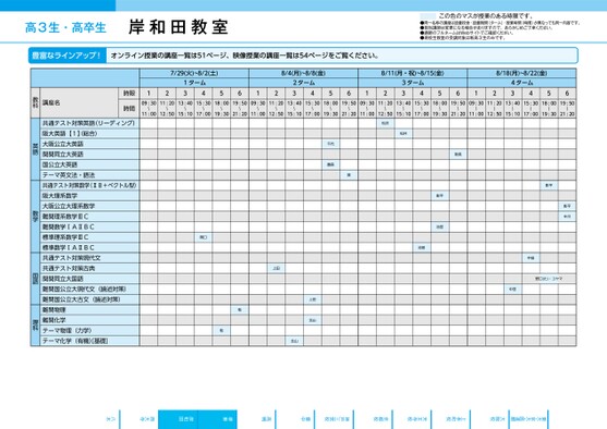 ●2025年度/夏期講習/近畿/堺東/高3・卒生/パターン34602025_56_5_533_11_20250319145020.csv/1ページ校了時削除高3生・高卒生岸和田教室この色のマスが授業のある時限です。●同一名称の講座は設置校舎・設置期間(ターム)・授業時間(時限)が異なっても同一内容です。●担当講師は変更になる場合がありますので、あらかじめご了承ください。●講師のフルネームはWebサイトでご確認ください。●現役生教室の受講対象は新高3生のみです。7/29(火)~8/2(土)1ターム431256128/4(月)~8/8(金)2ターム438/11(月・祝)~8/15(金)8/18(月)~8/22(金)56123ターム4356124ターム435609:3011:2013:4015:3018:0019:5009:3011:2013:4015:3018:0019:5009:3011:2013:4015:3018:0019:5009:3011:2013:4015:3018:0019:50〜〜〜〜〜〜〜〜〜〜〜〜〜〜〜〜〜〜〜〜〜〜〜〜11:0012:5015:1017:0019:3021:2011:0012:5015:1017:0019:3021:2011:0012:5015:1017:0019:3021:2011:0012:5015:1017:0019:3021:20松井松井敦見千代藤森巽影平池田池田影平影平中川中田野口(た)・コヤマ中田関口乾乾上田上田北山北山時限時間講座名教科共通テスト対策英語(リーディング)阪大英語【1】総合)大阪公立大英語関関同立大英語国公立大英語テーマ英文法・語法共通テスト対策数学(ⅡB+ベクトル型)阪大理系数学大阪公立大理系数学難関理系数学ⅢC難関数学ⅠAⅡBC標準理系数学ⅢC標準数学ⅠAⅡBC共通テスト対策現代文共通テスト対策古典関関同立大国語難関国公立大現代文(論述対策)難関国公立大古文(論述対策)難関物理難関化学テーマ物理(力学)テーマ化学(有機)[基礎]英語数学国語理科豊富なラインアップ!オンライン授業の講座一覧は51ページ、映像授業の講座一覧は54ページをご覧ください。八木西大寺岸和田堺東高槻豊中神戸三宮校京都校天王寺校上本町校大阪校東大・京大・医進館