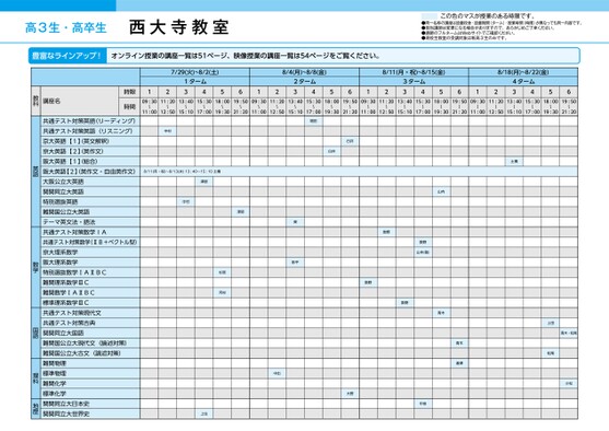 高3生・高卒生西大寺教室この色のマスが授業のある時限です。●同一名称の講座は設置校舎・設置期間(ターム)・授業時間(時限)が異なっても同一内容です。●担当講師は変更になる場合がありますので、あらかじめご了承ください。●講師のフルネームはWebサイトでご確認ください。●現役生教室の受講対象は新高3生のみです。豊富なラインアップ!オンライン授業の講座一覧は51ページ、映像授業の講座一覧は54ページをご覧ください。7/29(火)~8/2(土)ムータ134125612(4/8月)~8/8(金)ムータ2348/11(月・祝)~8/15(金)8/18(月)~8/22(金)5612ムータ3345612ムータ4345618:0019:5009:3011:2013:4015:3018:0019:5009:3011:2013:4015:3018:0019:5009:3011:2013:4015:3018:0019:5009:3011:2013:4015:3011:0012:5015:1017:0019:3021:2011:0012:5015:1017:0019:3021:2011:0012:5015:1017:0019:3021:2011:0012:5015:1017:0019:3021:20増田白井白井中村8/11(月・祝)〜8/13(水)13:40〜15:10土橋津留中村津留土橋山内巽影平中出数野数野山本(敏)数野数野青木大野中田杉原河村上住青木瀧澤青木・松尾上田松尾小松時限時間講座名教科共通テスト対策英語(リーディング)共通テスト対策英語(リスニング)京大英語【1】英文解釈)京大英語【2】英作文)阪大英語【1】総合)阪大英語【2】英作文・自由英作文)大阪公立大英語関関同立大英語特別選抜英語難関国公立大英語テーマ英文法・語法共通テスト対策数学IA共通テスト対策数学(ⅡB+ベクトル型)京大理系数学阪大理系数学特別選抜数学ⅠAⅡBC難関理系数学ⅢC難関数学ⅠAⅡBC標準理系数学ⅢC共通テスト対策現代文共通テスト対策古典関関同立大国語難関国公立大現代文(論述対策)難関国公立大古文(論述対策)難関物理標準物理難関化学標準化学関関同立大日本史関関同立大世界史英語数学国語理科地歴●2025年度/夏期講習/近畿/西大寺/高3・卒生/パターン34602025_56_5_535_11_20250319145020.csv/1ページ校了時削除
