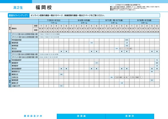 ●2025年度/夏期講習/広島/広島校/高2生/パターン34602025_56_6_611_32_20250318184609.csv/1ページ校了時削除この色のマスが授業のある時限です。●同一名称の講座は設置校舎・設置期間(ターム)・授業時間(時限)が異なっても同一内容です。●担当講師は変更になる場合がありますので、あらかじめご了承ください。●講師のフルネームはWebサイトでご確認ください。高2生福岡校7/29(火)~8/2(土)1ターム431256128/4(月)~8/8(金)2ターム438/11(月・祝)~8/15(金)8/18(月)~8/22(金)56123ターム4356124ターム435609:3011:2013:4015:3017:2019:1009:3011:2013:4015:3017:2019:1009:3011:2013:4015:3017:2019:1009:3011:2013:4015:3017:2019:10〜〜〜〜〜〜〜〜〜〜〜〜〜11:0012:5015:1017:0018:5020:4011:0012:5015:1017:0018:5020:4011:0012:5015:1017:0018:5020:4011:0012:5015:1017:0018:5020:40〜〜〜〜〜〜〜〜〜〜〜7/26(土)・7/27(日)19:10〜20:40堤(英)7/29(火)・7/30(水)17:20〜18:50久我久我●●●●7/30(水)・7/31(木)19:10〜20:40戸田8金)9:12:4戸田8/2(土)・8/3(日)17:20〜18:50大坪堤(英)山﨑永冨杉本8/13~8/15の3日間●●●●寺島中村大坪●●●●新谷文法の知識を一通り身につけた方向けの講座です。大澤●●戸田龍頭石原●●岡本宮本校岡福校島広時限時間講座名教科【ダイジェスト】夏から始める入試対策英語(特別選抜・難関)【ダイジェスト】夏から始める入試対策英語(難関・標準)特別選抜英語難関英語標準英語英文法個別指導英語【ダイジェスト】夏から始める入試対策数学(特別選抜・難関)【ダイジェスト】夏から始める入試対策数学(難関・標準)特別選抜数学難関数学標準数学個別指導数学難関現代文難関古文古典文法難関物理難関化学小論文入門英語数学国語理科小論文豊富なラインアップ!オンライン授業の講座一覧は10ページ、映像授業の講座一覧は21ページをご覧ください。
