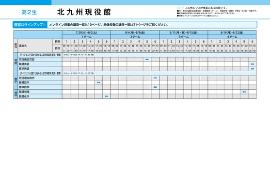 高2生北九州現役館この色のマスが授業のある時限です。●同一名称の講座は設置校舎・設置期間(ターム)・授業時間(時限)が異なっても同一内容です。●担当講師は変更になる場合がありますので、あらかじめご了承ください。●講師のフルネームはWebサイトでご確認ください。豊富なラインアップ!オンライン授業の講座一覧は10ページ、映像授業の講座一覧は21ページをご覧ください。7/29(火)~8/2(土)1ターム431256128/4(月)~8/8(金)2ターム438/11(月・祝)~8/15(金)8/18(月)~8/22(金)56123ターム4356124ターム435609:3011:2013:4015:3017:2019:1009:3011:2013:4015:3017:2019:1009:3011:2013:4015:3017:2019:1009:3011:2013:4015:3017:2019:10〜〜〜〜〜〜〜〜〜〜〜〜〜11:0012:5015:1017:0018:5020:4011:0012:5015:1017:0018:5020:4011:0012:5015:1017:0018:5020:4011:0012:5015:1017:0018:5020:40〜〜〜〜〜〜〜〜〜〜〜8/9(土)〜8/10(日)19:10〜20:40永冨8/9(土)〜8/10(日)17:20〜18:50石原石原野村柴田戸田真崎永冨加藤原田講座名時限時間【ダイジェスト】夏から始める入試対策英語(難関・標準)特別選抜英語難関英語標準英語【ダイジェスト】夏から始める入試対策数学(難関・標準)特別選抜数学難関数学標準数学難関物理難関化学教科英語数学理科
