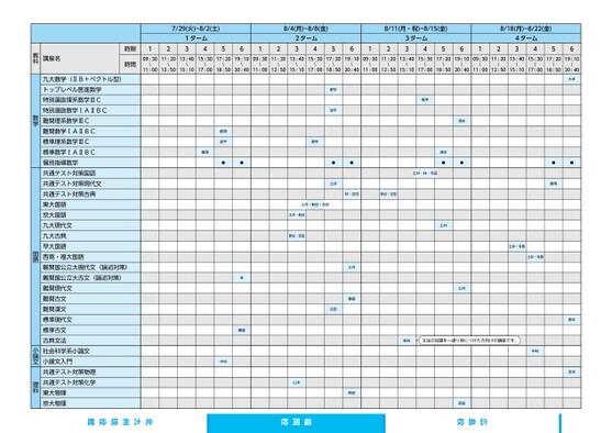 広島校北九州現役館●2025年度/夏期講習/九州/福岡校/高3・卒生/パターン34602025_56_7_711_11_20250318185205.csv/1ページ7/29(火)~8/2(土)8/4(月)~8/8(金)校了時削除この色のマスが授業のある時限です。戸田8/11(月・祝)~8/15(金)●同一名称の講座は設置校舎・設置期間(ターム)・授業時間(時限)が異なっても同一内容です。●担当講師は変更になる場合がありますので、あらかじめご了承ください。●講師のフルネームはWebサイトでご確認ください。8/18(月)~8/22(金)龍頭時限時間時限時間〜1〜〜2〜1ターム341ターム野竿〜〜34戸田〜〜127/29(火)~8/2(土)56128/4(月)~8/8(金)561258/11(月・祝)~8/15(金)6128/18(月)~8/22(金)戸田5609:3011:2013:4015:3017:2019:1009:3011:2013:4015:3017:2019:1009:3011:2013:4015:3019:1009:3011:2013:4015:3017:2019:1011:0012:5015:1017:0018:5020:4011:0012:5015:1017:0018:5020:4011:0012:5015:1017:0020:4011:0012:5015:1017:0018:5020:4009:3011:2013:4015:3017:2019:1009:3011:2013:4015:3019:1009:3011:2013:4017:2019:1009:3011:2013:4015:3017:20〜6〜〜1〜〜2〜11:0012:5015:1017:0018:5020:4011:0012:5015:1017:0020:4011:0012:5015:1018:5020:4011:0012:5015:1017:0018:504ターム344ターム〜〜34〜〜〜1〜〜2〜〜5〜〜619:10大坪〜20:40波平2ターム342ターム〜〜34〜〜〜6〜〜1〜〜2〜〜517:20〜波平18:50波平●2025年度/夏期講習/九州/福岡校/高3・卒生/パターン34602025_56_7_711_11_20250318185205.csv/1ページ野竿〜5〜龍頭3ターム343ターム〜〜34〜15:30野竿〜17:00野竿17:20〜5野竿18:50〜清水●土井・林・吉田清水〜6〜清水清水●●土井土井校了時削除土井・寺島土井・寺島土井・寺島土井・寺島●●●倉岡●倉岡岡本岡本宮本宮本新谷新谷文法の知識を一通り身につけた方向けの講座です。中村中村原田原田校了時削除校了時削除龍頭龍頭波平龍頭波平●●●●野竿野竿●土井●●●林・吉田新谷・吉田土井・林・吉田土井・新谷・吉田土井土井・新谷林・吉田新谷・吉田土井・新谷・吉田土井・新谷新谷・吉田新谷・吉田●土井土井林林重盛重盛中村中村吉田吉田土井土井重盛重盛原田山本山本●2025年度/夏期講習/九州/福岡校/高3・卒生/パターン34602025_56_7_711_11_20250318185205.csv/2ページ原田●2025年度/夏期講習/九州/福岡校/高3・卒生/パターン34602025_56_7_711_11_20250318185205.csv/2ページ校岡福東大理類数学東大文類数学京大理系数学京大文系数学阪大理系数学九大医進数学九大理系数学講座名抜理系数学ⅢCトル型)特別選抜数学ⅠAⅡBC特別選抜理系数学ⅢC特別選抜数学ⅠAⅡBC難関数学ⅠAⅡBC難関理系数学ⅢC難関数学ⅠAⅡBC標準数学ⅠAⅡBC標準理系数学ⅢC標準数学ⅠAⅡBC共通テスト対策国語個別指導数学策現代文共通テスト対策国語共通テスト対策現代文共通テスト対策古典東大国語文京大国語九大現代文九大古典大国語早大国語立大現代文(論述対策)西南・福大国語文(論述対策)難関国公立大現代文(論述対策)難関現代文難関国公立大古文(論述対策)難関現代文難関漢文難関古文文難関漢文標準古文標準現代文標準古文社会科学系小論文古典文法門社会科学系小論文理小論文入門対策化学共通テスト対策物理共通テスト対策化学東大物理京大物理数学教科教科数学数学数学国語国語小論文小論文理科理科高3生・高卒生