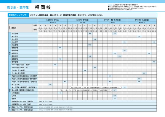 高3生・高卒生福岡校この色のマスが授業のある時限です。●同一名称の講座は設置校舎・設置期間(ターム)・授業時間(時限)が異なっても同一内容です。●担当講師は変更になる場合がありますので、あらかじめご了承ください。●講師のフルネームはWebサイトでご確認ください。豊富なラインアップ!オンライン授業の講座一覧は10ページ、映像授業の講座一覧は22ページをご覧ください。7/29(火)~8/2(土)1ターム431256128/4(月)~8/8(金)2ターム438/11(月・祝)~8/15(金)8/18(月)~8/22(金)56123ターム4356124ターム435609:3011:2013:4015:3017:2019:1009:3011:2013:4015:3017:2019:1009:3011:2013:4015:3017:2019:1009:3011:2013:4015:3017:2019:10〜〜〜〜〜〜〜〜〜〜〜〜〜11:0012:5015:1017:0018:5020:4011:0012:5015:1017:0018:5020:4011:0012:5015:1017:0018:5020:4011:0012:5015:1017:0018:5020:40〜〜〜〜〜〜〜〜〜〜〜大澤原田野黒美大澤宮本山本本村大澤野村本村大澤野村大澤岸田大澤梅野眞子馬場植松服部安平岸田安平瀬川中垣京大・一橋大・九大(文学部)など、本格的な論述を課す大学の対策としても効果的な講座です。下川京大・一橋大・九大(文学部)など、本格的な論述を課す大学の対策としても効果的な講座です。眞子中垣梅野下川8/9(土)09:30〜12:50瀬川8/9(土)13:40〜17:00瀬川8/16(土)・8/17(日)久我・野竿・大澤・原田時間割は16ページをご覧ください。8)09:3〜16:40久我・竿・大澤・時間割は16ページをご覧ください。8/16(土)・8/17(日)久我・野竿・大澤・岸田時間割は16ページをご覧ください。8)09:3〜16:40久我・竿・大澤・時間割は16ページをご覧ください。時限時間講座名教科九大物理東大化学京大化学九大化学九大生物難関物理標準物理難関化学標準化学難関生物標準生物テーマ物理(波動・電気)テーマ物理(磁気・熱)テーマ化学(有機)テーマ化学(無機)共通テスト対策歴史総合,日本史探究共通テスト対策歴史総合,世界史探究共通テスト対策地理総合,地理探究東大日本史東大世界史-難関国立大論述対策-東大地理-難関国立大論述対策-日本史論述日本史世界史地理重要テーマ対策(地形図)地理重要テーマ対策(気候)医進トライアル(英数物化型)医進トライアル(英数化生型)理科地歴総合