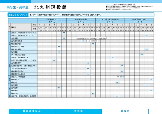 ●2025年度/夏期講習/九州/福岡校/高3・卒生/パターン34602025_56_7_711_11_20250318185205.csv/3ページ高3生・高卒生北九州現役館校了時削除この色のマスが授業のある時限です。●同一名称の講座は設置校舎・設置期間(ターム)・授業時間(時限)が異なっても同一内容です。●担当講師は変更になる場合がありますので、あらかじめご了承ください。●講師のフルネームはWebサイトでご確認ください。7/29(火)~8/2(土)1ターム431256128/4(月)~8/8(金)2ターム438/11(月・祝)~8/15(金)8/18(月)~8/22(金)56123ターム4356124ターム435609:3011:2013:4015:3017:2019:1009:3011:2013:4015:3017:2019:1009:3011:2013:4015:3017:2019:1009:3011:2013:4015:3017:2019:10〜〜〜〜〜〜〜〜〜〜〜〜〜11:0012:5015:1017:0018:5020:4011:0012:5015:1017:0018:5020:4011:0012:5015:1017:0018:5020:4011:0012:5015:1017:0018:5020:40〜〜〜〜〜〜〜〜〜〜〜永冨堤(英)九大以外で英作文を課す大学の対策としても効果的です。柴田8/6~8/8の3日間柴田堤(英)永冨石原野村石原龍頭清水野村大坪大坪波平莵原・重盛・寺島重盛瀬川永冨久我加藤本村土井原田時限時間講座名教科共通テスト対策英語(リーディング)共通テスト対策英語(リスニング)九大英語九大英作文特講特別選抜英語難関国公立大英語国公立大英語私大英語テーマ英文法・語法共通テスト対策数学IA共通テスト対策数学(ⅡB+ベクトル型)九大理系数学九大数学(ⅡB+ベクトル型)-難関大レベル-トップレベル医進数学標準理系数学ⅢC標準数学ⅠAⅡBC共通テスト対策国語難関現代文標準古文九大物理九大化学標準物理標準化学共通テスト対策地理総合,地理探究英語数学国語理科地歴豊富なラインアップ!オンライン授業の講座一覧は10ページ、映像授業の講座一覧は22ページをご覧ください。現役館州北九校岡福