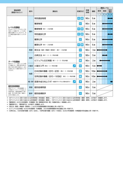 講座レベル標準12難関34特別選抜56講座種類(講座のねらい)教科講座名レベル別講座学力をレベルアップさせたい方を対象とした講座です。レベル別に講座が設置されていますので、自分に最適な講座を選ぶことができます。理科特別選抜物理難関物理難関物理(高1・2生共通)特別選抜化学難関化学難関化学(高1・2生共通)テーマ別講座特定のテーマ・分野について学習する講座です。得意分野の更なる強化や苦手分野の克服など、自分の目的に応じて講座を選ぶことができます。英語英文法-動詞・準動詞・関係詞-(高1・2生共通)国語古典文法(高1・2・3・卒生共通)ビジュアル古文常識(高1・2・3・卒生共通)小論文小論文入門(高2・3・卒生共通)地歴日本史集中講義(古代ー近世)(高2・3・卒生共通)世界史集中講義(古代ー18世紀)(高2・3・卒生共通)英語/数学答案作成力向上ラボ-全国のライバルと高め合おう-個別指導講座学習プランナー(河合塾講師)との学習カウンセリングで決定した学習内容を、個別指導員が丁寧に指導。苦手分野の克服、基礎力・応用力を養成します。英語個別指導英語数学個別指導数学授業形式授業時間講数対映90分5講対90分5講対映90分5講対映90分5講対90分5講対映90分5講対対映対映映オ対対90分90分90分90分3講5講2講5講90分10講90分10講90分2講90分5講90分5講*「【ダイジェスト】夏から始める入試対策英語(特別選抜・難関)」、「【ダイジェスト】夏から始める入試対策英語(難関・標準)」は内容が一部重複します。*「【ダイジェスト】夏から始める入試対策数学(特別選抜・難関)」、「【ダイジェスト】夏から始める入試対策数学(難関・標準)」は内容が一部重複します。*「難関数学」は2024年度夏期・冬期講習「高1難関数学中高一貫」の講座内容と一部重複します。*「難関現代文」、「標準現代文」は内容が一部重複します。*「英文法-動詞・準動詞・関係詞-」は2024年度夏期講習の同名講座と同一内容です。*「ビジュアル古文常識」は2024年度夏期・冬期講習、2025年度春期講習の同名講座と同一内容です。*「古典文法」、「日本史集中講義(古代ー近世)」、「世界史集中講義(古代ー18世紀)」は2024年度夏期・冬期講習の同名講座と同一内容です。