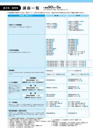 高3生・高卒生講座一覧1講座90分×5講※形式(授業分数または講数)の異なる講座もあります。▶夏期講習を受講するために「認定テスト」を受ける必要はありません。現在の学力や学習状況にあわせて講座を選択できます。講座種類(講座のねらい)英語数学共通テスト対策講座大学入学共通テストで高得点をめざす講座です。●共通テスト対策英語(リーディング)対映●共通テスト対策英語(リスニング)対映大学別対策講座各大学の出題傾向を踏まえた対策を行います。●東大英語対映●京大英語対映●阪大英語対●神大英語対●広大英語対●九大英語対●九大英作文特講対●早大英語対映●慶大英語対●西南大英語対●福大英語対●共通テスト対策数学ⅠA対映●共通テスト対策数学(ⅡB+ベクトル型)対映●共通テスト対策数学(統計的な推測)映●共通テスト対策数学(平面上の曲線と複素数平面)映●東大理類数学対映●東大文類数学対映●京大理系数学対映●京大文系数学対映●阪大理系数学対●広大理系数学対●九大医進数学対●九大理系数学対●九大数学(ⅡB+ベクトル型)対●九大数学(ⅡB+ベクトル型)-難関大レベル-対●東大答案作成力強化トレ(理類型)-全国のライバルと高め合おう-(高3生対象)オ●東大答案作成力強化トレ(文類型)-全国のライバルと高め合おう-(高3生対象)オ●京大答案作成力強化トレ(理系型)-全国のライバルと高め合おう-(高3生対象)オ●京大答案作成力強化トレ(文系型)-全国のライバルと高め合おう-(高3生対象)オ医進講座ハイレベルな内容に取り組み、医学部医学科の合格に必要な学力を養成します。●医進英語対●トップレベル医進数学対●医進トライアル〈英数物化型〉対映●医進トライアル〈英数化生型〉対映レベル別講座※学力をレベルアップさせたい方を対象とした講座です。レベル別に講座が設置されていますので、自分に最適な講座を選ぶことができます。特別選抜受講の目安偏差値65.0~●特別選抜英語対目標大学:東大・京大・医学部医学科難関受講の目安偏差値55.0~●難関国公立大英語対目標大学:難関国公立大・早慶大など●特別選抜理系数学ⅢC対●特別選抜数学ⅠAⅡBC対●難関理系数学ⅢC対●難関数学ⅠAⅡBC対標準受講の目安偏差値~55.0目標大学:国公立大・私立大●国公立大英語対●私大英語対オ●標準理系数学ⅢC対●標準数学ⅠAⅡBC対テーマ別講座特定のテーマ・分野について学習する講座です。得意分野の更なる強化や苦手分野の克服など、自分の目的に応じて講座を選ぶことができます。●テーマ英作文[発展]対●テーマ英文法・語法[発展]対●テーマ英文解釈対●テーマ英文法・語法対オ●ここで差がつく数学対●テーマ数学(場合の数と確率)オ●テーマ数学(数列・ベクトル)オ●テーマ数学(複素数平面・2次曲線)オ個別指導講座(現役生専用)学習プランナー(河合塾講師)との学習カウンセリングで決定した学習内容を、個別指導員が丁寧に指導。苦手分野の克服、基礎力・応用力を養成します。●個別指導英語対●個別指導数学対※レベル別講座の受講目安偏差値は、河合塾全統模試における偏差値です。*「難関国公立大英語」、「国公立大英語」は内容が一部重複します。*「共通テスト対策国語」は「共通テスト対策現代文」、「共通テスト対策古典」と内容が一部重複します。*「東大国語」、「東大現代文」は内容が一部重複します。*「京大国語」、「京大文系国語」は教材が重複します。*「早大国語」は「早大現代文」、「早大古文」と内容が一部重複します。*「広大化学」、「広大医進化学」は教材が重複します。*「九大理系数学」、「九大医進数学」は内容が一部重複します。*「京大国語」、「京大理系国語」、「京大文系国語」は内容が一部重複します。*「広大国語」、「広大国語現代文型」は内容が一部重複します。*「広大物理」、「広大医進物理」は教材が重複します。