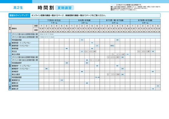高2生時間割夏期講習この色のマスが授業のある時限です。●同一名称の講座は設置校舎・設置期間(ターム)・授業時間(時限)が異なっても同一内容です。●担当講師は変更になる場合がありますので、あらかじめご了承ください。●講師のフルネームはWebサイトでご確認ください。豊富なラインアップ!オンライン授業の講座一覧は12ページ、映像授業の講座一覧は13ページをご覧ください。7/29(火)~8/2(土)1ターム431256128/4(月)~8/8(金)2ターム438/11(月・祝)~8/15(金)8/18(月)~8/22(金)56123ターム4356124ターム435610:0011:5014:3016:2018:1020:0010:0011:5014:3016:2018:1020:0010:0011:5014:3016:2018:1020:0010:0011:5014:3016:2018:1020:00〜〜〜〜〜〜〜〜〜〜〜〜〜〜〜〜〜〜〜〜〜〜〜〜11:3013:2016:0017:5019:4021:3011:3013:2016:0017:5019:4021:3011:3013:2016:0017:5019:4021:3011:3013:2016:0017:5019:4021:308/9(土)14:30〜17:50山川7/20(日)18:10〜21:30山川塩飽朝枝岩崎片岡竹内松野竹内安達山川高橋(弘)山川8/4~8/6の3日間8/18~8/20の3日間本間8/11~8/13の3日間竹内8/14・8/15の2日間岩崎重政佐野8/11~8/13の3日間岩崎塩飽8/4・8/5の2日間岩崎三浦・近藤塩飽重政服部福田玉虫大倉時限時間講座名教科【ダイジェスト】夏から始める入試対策英語(特別選抜・難関)【ダイジェスト】夏から始める入試対策英語(難関・標準)特別選抜英語難関英語-トップレベル-難関英語-ハイレベル-標準英語英文法東北大英語【ダイジェスト】夏から始める入試対策数学(特別選抜・難関)【ダイジェスト】夏から始める入試対策数学(難関・標準)特別選抜数学難関数学-トップレベル-難関数学-ハイレベル-標準数学東北大数学特別選抜国語難関現代文難関古文難関物理難関化学英語数学国語理科