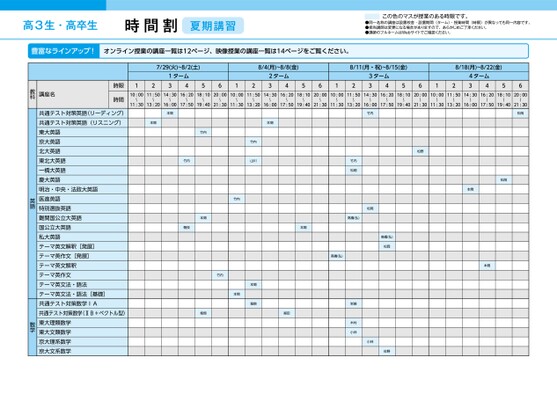 高3生・高卒生時間割夏期講習この色のマスが授業のある時限です。●同一名称の講座は設置校舎・設置期間(ターム)・授業時間(時限)が異なっても同一内容です。●担当講師は変更になる場合がありますので、あらかじめご了承ください。●講師のフルネームはWebサイトでご確認ください。豊富なラインアップ!オンライン授業の講座一覧は12ページ、映像授業の講座一覧は14ページをご覧ください。7/29(火)~8/2(土)1ターム431256128/4(月)~8/8(金)2ターム438/11(月・祝)~8/15(金)8/18(月)~8/22(金)56123ターム4356124ターム435610:0011:5014:3016:2018:1020:0010:0011:5014:3016:2018:1020:0010:0011:5014:3016:2018:1020:0010:0011:5014:3016:2018:1020:0011:3013:2016:0017:5019:4021:3011:3013:2016:0017:5019:4021:3011:3013:2016:0017:5019:4021:3011:3013:2016:0017:5019:4021:30〜〜〜〜〜〜〜〜〜〜〜〜〜〜〜〜〜〜〜〜〜〜〜〜本間本間竹内竹内本間朝枝本間竹内山川竹内竹内本間本間塩飽塩飽福田佐野塩飽重政竹内松岡竹内松岡松岡高橋(弘)本間高橋(弘)松岡高橋(弘)岩崎木村小林佐野小林木村重政松野松岡本間本間福田岩崎時限時間講座名教科共通テスト対策英語(リーディング)共通テスト対策英語(リスニング)東大英語京大英語北大英語東北大英語一橋大英語慶大英語明治・中央・法政大英語医進英語特別選抜英語難関国公立大英語国公立大英語私大英語テーマ英文解釈[発展]テーマ英作文[発展]テーマ英文解釈テーマ英作文テーマ英文法・語法テーマ英文法・語法[基礎]共通テスト対策数学IA共通テスト対策数学(ⅡB+ベクトル型)東大理類数学東大文類数学京大理系数学京大文系数学北大理系数学東北大理系数学東北大数学(ⅡB+ベクトル型)一橋大数学英語数学数学