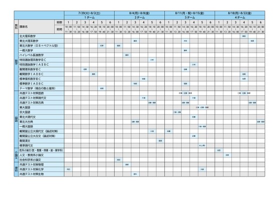 本間塩飽岩崎7/29(火)~8/2(土)塩飽121ターム3456128/4(月)~8/8(金)田2ターム348/11(月・祝)~8/15(金)8/18(月)~8/22(金)561木村小林23ターム3456124ターム345610:0011:5014:3016:2018:1020:0010:0011:5014:3016:2018:1020:0010:0011:50〜11:30〜〜〜〜13:207/29(火)~8/2(土)16:0017:5019:40〜〜21:3011:30〜〜〜〜13:208/4(月)~8/8(金)16:0017:5019:40〜〜21:3011:3014:30小林〜16:2018:1020:0010:0011:5014:3016:2018:1020:00〜〜8/11(月・祝)~8/15(金)16:0017:50〜佐野19:4013:20〜〜21:3011:30〜〜〜〜13:208/18(月)~8/22(金)16:0017:5019:40〜21:30121ターム34561重政22ターム34重政小林56123ターム34木村5612福田4ターム34岩崎5610:0011:50〜〜11:3013:2014:30〜佐野16:0016:20〜17:5018:10佐野〜19:4020:00〜21:3010:00塩飽〜11:3011:5014:3016:2018:1020:0010:0011:50〜〜〜〜〜〜13:2016:0017:5019:4021:3011:3013:2014:30〜岩崎16:0016:20小林〜17:5018:1020:0010:0011:5014:3016:2018:1020:00〜〜〜〜〜〜〜〜19:4021:3011:3013:2016:0017:5019:4021:30〜重政岩崎小林●2025年度/夏期講習/東北/仙台/高3・卒生/パターン34602025_56_2_251_11_20250328163251.csv/1ページ塩飽時間時間時限時限テーマ英文法・語法[基礎]共通テスト対策数学IA共通テスト対策数学(ⅡB+ベクトル型)東大理類数学東大文類数学京大理系数学京大文系数学ハイレベル医進数学北大理系数学特別選抜理系数学ⅢC講座名抜数学ⅠAⅡBCトル型)難関理系数学ⅢCハイレベル医進数学特別選抜理系数学ⅢC特別選抜数学ⅠAⅡBC難関理系数学ⅢCの数と確率)難関数学ⅠAⅡBC標準理系数学ⅢC共通テスト対策現代文標準数学ⅠAⅡBCテーマ数学(場合の数と確率)東大国語共通テスト対策国語共通テスト対策現代文東北大現代文共通テスト対策古典東大国語一橋大国語京大国語立大現代文(論述対策)東北大現代文古文(論述対策)東北大古典一橋大国語難関国公立大現代文(論述対策)系小論文(医・看護・保・歯・薬学系)難関国公立大古文(論述対策)難関漢文系小論文標準現代文対策物理医系小論文(医・看護・保健・歯・薬学系)通テスト対策化学人文・教育系小論文社会科学系小論文共通テスト対策物理共通テスト対策化学東大化学共通テスト対策生物東大物理東北大物理東大化学東北大化学教科数学教科数学数学数学国語国語小論文小論文理科理科理科佐野岩崎塩飽岩崎寺田寺田池田池田渡部渡部岩崎岩崎塩飽岩崎佐藤・近藤・服部岩崎近藤・服部近藤・服部塩飽三浦・近藤佐藤・近藤・服部三浦近藤・服部近藤・服部近藤・服部三浦佐藤三浦・近藤近藤・服部服部三浦佐藤服部唐牛渡部渡部寺田唐牛寺田小林三浦三浦佐藤近藤近藤三浦・近藤・服部三浦・近藤・服部三浦・服部三浦・服部井上(興)井上(興)大倉大倉校了時削除岩崎佐野工藤・近藤・服部佐野近藤・服部工藤・近藤・服部近藤・服部近藤・服部近藤・服部池田池田池田池田玉虫校了時削除玉虫大倉大倉●2025年度/夏期講習/東北/仙台/高3・卒生/パターン34602025_56_2_251_11_20250328163251.csv/2ページ渡部渡部寺田寺田
