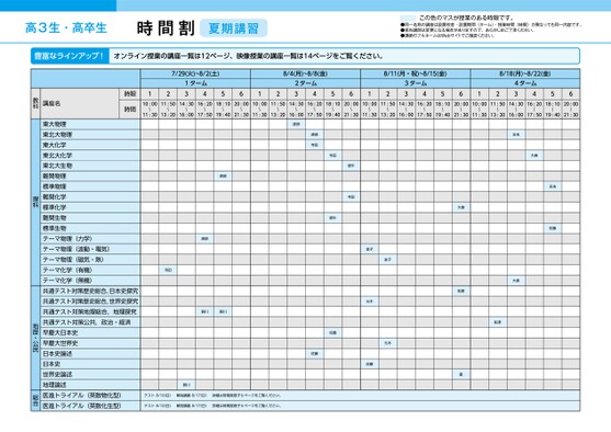 高3生・高卒生時間割近藤・服部近藤・服部三浦・服部夏期講習三浦佐藤服部この色のマスが授業のある時限です。●同一名称の講座は設置校舎・設置期間(ターム)・授業時間(時限)が異なっても同一内容です。●担当講師は変更になる場合がありますので、あらかじめご了承ください。●講師のフルネームはWebサイトでご確認ください。近藤豊富なラインアップ!オンライン授業の講座一覧は12ページ、映像授業の講座一覧は14ページをご覧ください。井上(興)池田7/29(火)~8/2(土)1ターム4312568/4(月)~8/8(金)池田1渡部22ターム438/11(月・祝)~8/15(金)池田8/18(月)~8/22(金)56123ターム4356124ターム435610:00寺〜11:3011:5014:3016:2018:1020:0010:0011:5014:3016:2018:1020:0010:00〜〜〜〜13:207/29(火)~8/2(土)16:0017:519:40〜〜21:3011:30〜〜唐牛13:208/4月)~8/8(金)16:007509:40〜〜〜〜21:3011:3011:5014:3016:20大倉〜〜8/11(月・祝)~8/15(金)16:0075018:1019:01320〜〜20:0010:0011:5014:3016:2018:1020:00〜〜21:3011:30〜〜〜〜13:20/18(月)~8/22(金)6:07501:40〜21:30121ターム43渡部5612渡部2ターム43渡部唐牛65123ターム4356124ターム43玉虫5610:0011:5014:3016:2018:1020:0010:0011:5014:30〜〜〜〜〜〜〜〜〜11:3013:2016:0017:5019:4021:3011:3013:2016:0016:20寺田〜17:5018:10〜寺田19:4020:00〜寺田21:3010:0011:5014:3016:2018:1020:0010:0011:5014:30〜〜〜〜〜〜〜〜11:3013:2016:0017:5019:4021:3011:3013:2016:0016:20〜大倉17:5018:10玉虫〜19:4020:00〜21:30〜大倉●2025年度/夏期講習/東北/仙台/高3・卒生/パターン34602025_56_2_251_11_20250328163251.csv/2ページ渡部唐牛唐牛渡部渡部寺田寺田賀川賀川賀川賀川佐藤賀川8/10(日)〜8/17(日)10:00〜18:40・大倉・渡部・竹内・重政時間割は11ページをご覧ください。佐藤8/10(日)〜8/17(日)10:00〜18:40・大倉・佐藤・竹内・重政時間割は11ページをご覧ください。賀川8/10(日)〜8/17(日)10:00〜18:40・大倉・渡部・竹内・重政時間割は11ページをご覧ください。スト810)説義817)詳細は時間割冊子6ペーご覧ださい。8/10(日)〜8/17(日)10:00〜18:40・大倉・佐藤・竹内・重政時間割は11ページをご覧ください。スト810)説義817)詳細は時間割冊子6ペーご覧ださい。寺田唐牛佐藤佐藤金子金子元木金子金子元木元木佐藤佐藤元木大倉舩倉舩倉星星玉虫佐藤校了時削除大倉船津大倉船津時間時限時間時限東北大古典一橋大国語難関国公立大現代文(論述対策)難関国公立大古文(論述対策)難関漢文標準現代文医系小論文(医・看護・保健・歯・薬学系)人文・教育系小論文社会科学系小論文共通テスト対策物理共通テスト対策化学共通テスト対策生物東北大生物難関物理理講座名理難関化学学東北大生物難関物理標準物理難関化学理(力学)標準化学理(波動・電気)難関生物理(磁気・熱)標準生物学(有機)テーマ物理(力学)テーマ物理(波動・電気)通テスト,日本史探究テーマ物理(磁気・熱)通テスト,世界史探究テーマ化学(有機)共通テスト対策地理総合,地理探究テーマ化学(無機),政治・経済共通テスト対策歴史総合,日本史探究早慶大日本史共通テスト対策歴史総合,世界史探究慶大世界共通テスト対策地理総合,地理探究日本史論述共通テスト対策公共,政治・経済早慶大日本史世界史論述早慶大世界史日本史論述アル(英数物化型)日本史ライアル(英数化生型)世界史論述地理論述医進トライアル(英数物化型)医進トライアル(英数化生型)語小論文教科理科教科理科理科理科地歴・公民地歴・公民総合総合
