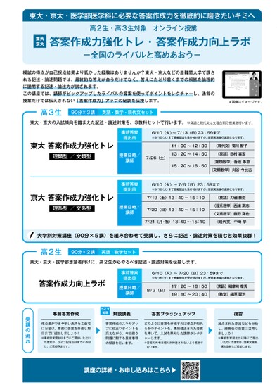 東大・京大・医学部医学科に必要な答案作成力を徹底的に磨きたいキミへ高2生・高3生対象オンライン授業東大京大答案作成力強化トレ・答案作成力向上ラボ-全国のライバルと高めあおう-模試の得点が自己採点結果より低かった経験はありませんか?東大・京大などの最難関大学で課される記述・論述問題では、最終的な答えが合うだけでなく、答えにたどり着くまでの根拠を論理的に説明する記述・論述力が試されます。この講座では、講師がピックアップしたライバルの答案を使ってポイントをレクチャーし、通常の授業だけでは伝えきれない「答案作成力」アップの秘訣を伝授します。高3生90分×3講英語・数学・現代文セット*画像はイメージです。東大・京大の入試傾向を踏まえた記述・論述対策を、3教科セットで行います。※英語と現代文は文理合同で授業を行います。東大答案作成力強化トレ理類型/文類型事前答案提出日6/10(火)〜7/13(日)23:59まで※9/16(火)まで答案提出を受け付けますが、授業実施後の返却となります。授業日時/講師7/26(土)11:00〜12:30(現代文)菊川智子13:20〜14:50(英語)田村喜宏15:20〜16:50(理類数学)香坂季京(文類数学)刈谷今比古京大答案作成力強化トレ理系型/文系型事前答案提出日授業日時/講師6/10(火)〜7/6(日)23:59まで※9/16(火)まで答案提出を受け付けますが、授業実施後の返却となります。7/19(土)13:40〜15:10(英語)刀泰史7/20(日)13:40〜15:10(理系数学)西浦高志(文系数学)藤野真也7/21(月・祝)13:40〜15:10(現代文)中崎学大学別対策講座(90分×5講)を組み合わせて受講し、さらに記述・論述対策を積むと効果抜群!高2生90分×2講英語・数学セット東大・京大・医学部志望者向けに、高2生からやるべき記述・論述対策を伝授します。答案作成力向上ラボ事前答案提出日授業日時/講師6/10(火)〜7/20(日)23:59まで※9/16(火)まで答案提出を受け付けますが、授業実施後の返却となります。8/3(日)17:20〜18:50(英語)胡摩﨑章秀19:10〜20:40(数学)樋原賢治事前答案作成ライブ配信解説講義答案ブラッシュアップ復習得点差がつきやすい良問をご自宅にお届け。事前に答案を作成し期日までに提出しましょう!※事前答案提出日までにご提出いただいた答案は、ライブ配信当日までに添削し、ご返却予定です。答案作成のスキルアップに役立つポイントを交えながら、今回扱う問題に関する基本事項の解説を行います。どのように答案を作成すれば得点が取れるかのポイントを、事前提出された答案を用いて、入試を熟知した講師がレクチャーします。※答案の共有は個人が特定されないよう匿名で行います。減点された原因などを分析し、授業後の復習に活用しましょう!※事前答案提出日以降にご提出いただいた答案は、授業実施後、順次添削しご返却します。受講の流れ講座の詳細・お申し込みはこちら▶