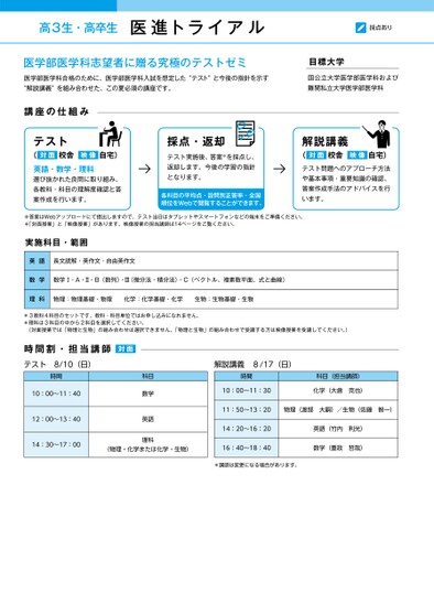 高3生・高卒生医進トライアル採点あり医学部医学科志望者に贈る究極のテストゼミ目標大学医学部医学科合格のために、医学部医学科入試を想定した“テスト”と今後の指針を示す“解説講義”を組み合わせた、この夏必須の講座です。国公立大学医学部医学科および難関私立大学医学部医学科講座の仕組みテスト対面(校舎自宅)映像英語・数学・理科選び抜かれた良問に取り組み、各教科・科目の理解度確認と答案作成を行います。採点・返却テスト実施後、答案※を採点し、返却します。今後の学習の指針となります。各科目の平均点・設問別正答率・全国順位をWebで閲覧することができます。解説講義映像対面(校舎自宅)テスト問題へのアプローチ方法や基本事項・重要知識の確認、答案作成手法のアドバイスを行います。※答案はWebアップロードにて提出しますので、テスト当日はタブレットやスマートフォンなどの端末をご準備ください。*「対面授業」と「映像授業」があります。映像授業の担当講師は14ページをご覧ください。実施科目・範囲英語長文読解・英作文・自由英作文数学数学Ⅰ・A・Ⅱ・B(数列)・Ⅲ(微分法・積分法)・C(ベクトル、複素数平面、式と曲線)理科物理:物理基礎・物理化学:化学基礎・化学生物:生物基礎・生物*3教科4科目のセットです。教科・科目単位ではお申し込みになれません。*理科は3科目の中から2科目を選択してください。(対面授業では「物理と生物」の組み合わせは選択できません。「物理と生物」の組み合わせで受講する方は映像授業を受講してください。)時間割・担当講師テスト8/10(日)対面時間10:00~11:4012:00~13:4014:30~17:00科目数学英語理科(物理・化学または化学・生物)解説講義8/17(日)時間10:00~11:30科目(担当講師)化学(大倉克也)11:50~13:20物理(渡部大嗣)/生物(佐藤智一)14:20~16:20英語(竹内利光)16:40~18:40数学(重政哲哉)*講師は変更になる場合があります。