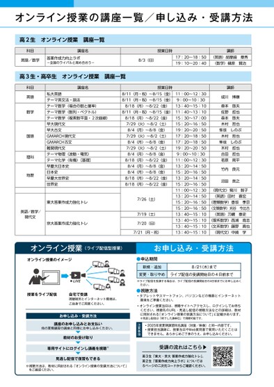 オンライン授業の講座一覧/申し込み・受講方法高2生オンライン授業講座一覧科目英語/数学講座名答案作成力向上ラボ-全国のライバルと高め合おう-高3生・高卒生オンライン授業講座一覧授業日時講師8/3(日)17:20~18:5019:10~20:40(英語)胡摩﨑章秀(数学)樋原賢治科目英語数学国語理科地歴講座名私大英語テーマ英文法・語法テーマ数学(場合の数と確率)テーマ数学(数列・ベクトル)テーマ数学(複素数平面・2次曲線)早大現代文早大古文GMARCH現代文GMARCH古文難関現代文テーマ物理(波動・電気)テーマ化学(有機)[基礎]早慶大日本史日本史早慶大世界史世界史授業日時8/11(月・祝)~8/15(金)8/11(月・祝)~8/15(金)8/18(月)~8/22(金)8/11(月・祝)~8/15(金)8/18(月)~8/22(金)7/29(火)~8/2(土)8/4(月)~8/8(金)7/29(火)~8/2(土)8/4(月)~8/8(金)7/29(火)~8/2(土)8/4(月)~8/8(金)8/18(月)~8/22(金)8/4(月)~8/8(金)8/4(月)~8/8(金)8/18(月)~8/22(金)8/18(月)~8/22(金)英語⁄数学⁄現代文東大答案作成力強化トレ京大答案作成力強化トレ7/26(土)7/19(土)7/20(日)7/21(月・祝)11:00~12:309:00~10:3013:40~15:1011:40~13:1015:30~17:0015:20~16:5019:20~20:5017:20~18:5017:20~18:5019:20~20:509:00~10:3011:00~12:3013:20~14:5015:20~16:5013:20~14:5015:20~16:5011:00~12:3013:20~14:5015:20~16:5015:20~16:5013:40~15:1013:40~15:1013:40~15:1013:40~15:10講師成川博康森本啓夫佐野哲也森本啓夫木村哲也隼坂しのぶ木村哲也隼坂しのぶ木村哲也合田哲也若原周平竹内良元沼田英之(現代文)菊川智子(英語)田村喜宏(理類数学)香坂季京(文類数学)刈谷今比古(英語)刀禰泰史(理系数学)西浦高志(文系数学)藤野真也(現代文)中崎学オンライン授業(ライブ配信型授業)お申し込み・受講方法※ライブ配信を受講する場合は、ライブ配信の受講開始日の4日前までにお申し込みください。●視聴方法タブレットやスマートフォン、パソコンなどの機器とインターネット環境をご準備ください。オンライン授業当日は、視聴サイトへアクセスし、ログインしてお待ちください。視聴先のURL・見逃し配信の視聴方法などの詳細は、教材に同封される「オンライン授業の受講方法について」に記載があります。※見逃し配信は「終了した講単位」で視聴可能です。2025年度夏期講習同名講座(対面/映像)と同一内容です。授業担当講師に、授業当日やWeb質問書で質問いただくことはできません。あらかじめご了承のうえ、お申し込みください。注意事項変更・取りやめライブ配信の受講開始日の4日前まで●申込期間新規・追加8/21(木)まで受講の流れはこちら▶高3生「東大・京大答案作成力強化トレ」、高2生「答案作成力向上ラボ」については5ページの二次元コードからご確認ください。オンライン授業のイメージILVE授業をライブ配信自宅で受講視聴端末とインターネット環境は、ご自身でご用意ください。お申し込み・受講方法講座のお申し込みとお支払い他の夏期講習の講座と同様にお申し込みください。教材のお受け取り専用サイトにログインし講義を視聴※見逃し配信で復習もできる※視聴方法は、教材に同封される「オンライン授業の受講方法について」をご確認ください。