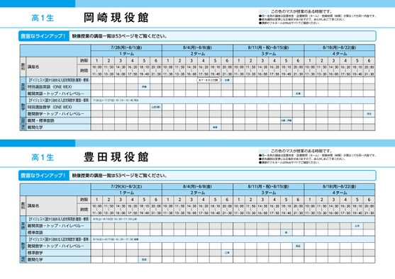 高1生岡崎現役館豊富なラインアップ!映像授業の講座一覧は53ページをご覧ください。この色のマスが授業のある時限です。●同一名称の講座は設置校舎・設置期間(ターム)・授業時間(時限)が異なっても同一内容です。●担当講師は変更になる場合がありますので、あらかじめご了承ください。●講師のフルネームはWebサイトでご確認ください。7/28(月)8/1(金)~/1ターム431256128/4(月)~8/8(金)2ターム438/11(月・祝)~8/15(金)8/18(月)~8/22(金)56123ターム4356124ターム435610:0011:5014:3016:2018:1020:0010:0011:5014:3016:2018:1020:0010:0011:5014:3016:2018:1020:0010:0011:5014:3016:2018:1020:00〜〜〜〜〜〜〜〜〜〜〜〜〜〜〜〜〜〜〜〜〜〜〜〜11:3013:2016:0017:5019:4021:3011:3013:2016:0017:5019:4021:3011:3013:2016:0017:5019:4021:3011:3013:2016:0017:5019:4021:30永瀬日嵩・伊藤河合この色のマスが授業のある時限です。この色のマスが授業のある時限です。●同一名称の講座は設置校舎・設置期間(ターム)・授業時間(時限)が異なっても同一内容です。●担当講師は変更になる場合がありますので、あらかじめご了承ください。●同一名称の講座は設置校舎・設置期間(ターム)・授業時間(時限)が異なっても同一内容です。●講師のフルネームはWebサイトでご確認ください。●担当講師は変更になる場合がありますので、あらかじめご了承ください。●講師のフルネームはWebサイトでご確認ください。7/26(土)〜7/27(日)18:10〜19:40河合伊藤山田(勝)8/7・8の2日間永瀬若原講座名時限時間【ダイジェスト】夏から始める入試対策英語(難関・標準)特別選抜英語(ONEWEX)難関英語-トップ・ハイレベル-【ダイジェスト】夏から始める入試対策数学(難関・標準)特別選抜数学(ONEWEX)難関数学-トップ・ハイレベル-難関・標準国語難関化学教科英語数学国語理科高1生高1生豊田現役館豊富なラインアップ!映像授業の講座一覧は53ページをご覧ください。7/29(火)~8/2(土)1ターム431256128/4(月)~8/8(金)2ターム438/11(月・祝)~8/15(金)8/18(月)~8/22(金)56123ターム4356124ターム435610:0011:5014:3016:2018:1020:0010:0011:5014:3016:2018:1020:0010:0011:5014:3016:2018:1020:0010:0011:5014:3016:2018:1020:00〜〜〜〜〜〜〜〜〜〜〜〜〜〜〜〜〜〜〜〜〜〜〜〜11:3013:2016:0017:5019:4021:3011:3013:2016:0017:5019:4021:3011:3013:2016:0017:5019:4021:3011:3013:2016:0017:5019:4021:308/9(土)〜8/10(日)16:20〜17:50山本8/16(土)〜8/17(日)16:20〜17:50加藤若原江澤山本森高田講座名時限時間【ダイジェスト】夏から始める入試対策英語(難関・標準)難関英語-トップ・ハイレベル-標準英語【ダイジェスト】夏から始める入試対策数学(難関・標準)難関数学-トップ・ハイレベル-標準数学難関化学教科英語数学理科