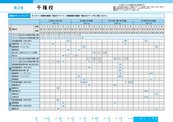 ●2025年度/夏期講習/中部/名駅校/高2生/パターン34602025_56_4_414_32_20250318184034.csv/1ページ校了時削除この色のマスが授業のある時限です。●同一名称の講座は設置校舎・設置期間(ターム)・授業時間(時限)が異なっても同一内容です。●担当講師は変更になる場合がありますので、あらかじめご了承ください。●講師のフルネームはWebサイトでご確認ください。高2生千種校7/29(火)~8/2(土)1ターム431256128/4(月)~8/8(金)2ターム438/11(月・祝)~8/15(金)8/18(月)~8/22(金)56123ターム4356124ターム435609:1011:0013:4015:3017:2019:1009:1011:0013:4015:3017:2019:1009:1011:0013:4015:3017:2019:1009:1011:0013:4015:3017:2019:10〜〜〜〜〜〜〜〜〜〜〜〜〜10:4012:3015:1017:0018:5020:4010:4012:3015:1017:0018:5020:4010:4012:3015:1017:0018:5020:4010:4012:3015:1017:0018:5020:40〜〜〜〜〜〜〜〜〜〜〜7/26(土)〜7/27(日)13:40〜15:10長瀬7/31(木)〜8/1(金)19:10〜20:40中野7/26(土)〜7/27(日)19:10〜20:40青木8/11(月・祝)〜8/12(火)19:10〜20:40松延登木長瀬青木植田山本塚田7/29~31の3日間守屋8/4・5の2日間玉置松延笹村塚田7/31・8/1の2日間小倉8/6・7の2日間水嶋河合8/6・7の2日間三田村8/11・12の2日間水嶋安達大庭河合安達・伊藤・野村村山堀井横井窪田青野坂本大髙小倉三田村野村河原森本(将)安達・伊藤・野村佐藤(浩)宮地村瀬(宗)山上佐藤(浩)井上(摩)坂下大髙四日市豊田堤岡崎刈谷中垣豊橋浜松岐阜星ヶ丘千種名駅時限時間講座名教科【ダイジェスト】夏から始める入試対策英語(特別選抜・難関)【ダイジェスト】夏から始める入試対策英語(難関・標準)特別選抜英語(ONEWEX)難関英語-トップレベル-難関英語-ハイレベル-標準英語知らないと損するリスニング対策英文法【ダイジェスト】夏から始める入試対策数学(特別選抜・難関)【ダイジェスト】夏から始める入試対策数学(難関・標準)特別選抜理系数学中高一貫(ONEWEX)特別選抜数学(ONEWEX)難関理系数学中高一貫難関数学-トップレベル-難関数学-ハイレベル-標準数学特別選抜国語(ONEWEX)難関現代文難関古文標準現代文標準古文古典文法特別選抜物理(ONEWEX)難関物理特別選抜化学(ONEWEX)難関化学日本史世界史日本史集中講義(古代―近世)世界史集中講義(古代―18世紀)津英語数学国語理科地歴豊富なラインアップ!オンライン授業の講座一覧は51ページ、映像授業の講座一覧は53ページをご覧ください。