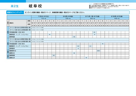 高2生岐阜校この色のマスが授業のある時限です。●同一名称の講座は設置校舎・設置期間(ターム)・授業時間(時限)が異なっても同一内容です。●担当講師は変更になる場合がありますので、あらかじめご了承ください。●講師のフルネームはWebサイトでご確認ください。豊富なラインアップ!オンライン授業の講座一覧は51ページ、映像授業の講座一覧は53ページをご覧ください。7/29(火)~8/2(土)1ターム431256128/4(月)~8/8(金)2ターム438/11(月・祝)~8/15(金)8/18(月)~8/22(金)56123ターム4356124ターム435609:1011:0013:4015:3017:2019:1009:1011:0013:4015:3017:2019:1009:1011:0013:4015:3017:2019:1009:1011:0013:4015:3017:2019:10〜〜〜〜〜〜〜〜〜〜〜〜〜10:4012:3015:1017:0018:5020:4010:4012:3015:1017:0018:5020:4010:4012:3015:1017:0018:5020:4010:4012:3015:1017:0018:5020:40〜〜〜〜〜〜〜〜〜〜〜8/23(土)13:40〜17:00盧山8/23(土)13:40〜17:00室田8/16(土)17:20〜20:40西畑8/16(土)17:20〜20:40宮田室田盧山川野村瀬伊藤宮田小田谷口西畑佐藤(浩)西浦若原講座名時限時間【ダイジェスト】夏から始める入試対策英語(特別選抜・難関)【ダイジェスト】夏から始める入試対策英語(難関・標準)特別選抜英語(ONEWEX)難関英語-トップ・ハイレベル-標準英語【ダイジェスト】夏から始める入試対策数学(特別選抜・難関)【ダイジェスト】夏から始める入試対策数学(難関・標準)特別選抜数学(ONEWEX)難関数学-トップ・ハイレベル-標準数学難関現代文難関古文難関物理難関化学教科英語数学国語理科