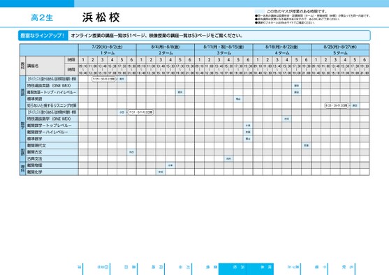 ●2025年度/夏期講習/中部/岐阜/高2生/パターン34602025_56_4_412_32_20250314195124.csv/1ページ校了時削除この色のマスが授業のある時限です。●同一名称の講座は設置校舎・設置期間(ターム)・授業時間(時限)が異なっても同一内容です。●担当講師は変更になる場合がありますので、あらかじめご了承ください。●講師のフルネームはWebサイトでご確認ください。高2生浜松校7/29(火)~8/2(土)8/4(月)~8/8(金)8/11(月・祝)~8/15(金)8/18(月)~8/22(金)8/25(月)~8/27(水)1ターム431256122ターム4356123ターム4356124ターム4356125ターム435609:1011:0013:4015:3017:3019:3009:1011:0013:4015:3017:3019:30909:1011:0013:4015:3017:30719:3009:1011:0013:4015:3017:3019:3009:1011:0013:4015:3017:3019:30〜〜〜〜〜〜〜〜〜〜〜〜〜〜〜〜〜〜〜〜〜〜〜〜10:4012:3015:1017:0018:5020:4010:4012:3015:1017:0018:5020:40110:4012:3015:1017:0018:50920:4010:4012:3015:1017:0018:5020:4010:4012:3015:1017:0018:5020:40〜〜〜〜〜〜7/29・30の2日間青木青木小田7/31・8/1の2日間河合小林中村8/25・26の2日間原田室田原田谷口安達亀山小田市野鷲山河合津四日市豊田岡崎刈谷豊橋浜松岐阜星ヶ丘千種名駅講座名時限時間【ダイジェスト】夏から始める入試対策英語(難関・標準)特別選抜英語(ONEWEX)難関英語-トップ・ハイレベル-標準英語知らないと損するリスニング対策【ダイジェスト】夏から始める入試対策数学(難関・標準)特別選抜数学(ONEWEX)難関数学-トップレベル-難関数学-ハイレベル-標準数学難関現代文難関古文古典文法難関物理難関化学教科英語数学国語理科豊富なラインアップ!オンライン授業の講座一覧は51ページ、映像授業の講座一覧は53ページをご覧ください。