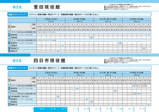 ●2025年度/夏期講習/中部/岡崎/高2生/パターン34602025_56_4_450_32_20250314195124.csv/1ページ校了時削除この色のマスが授業のある時限です。●同一名称の講座は設置校舎・設置期間(ターム)・授業時間(時限)が異なっても同一内容です。●担当講師は変更になる場合がありますので、あらかじめご了承ください。●講師のフルネームはWebサイトでご確認ください。高2生豊田現役館7/29(火)~8/2(土)1ターム431256128/4(月)~8/8(金)2ターム438/11(月・祝)~8/15(金)8/18(月)~8/22(金)56123ターム4356124ターム435610:0011:5014:3016:2018:1020:0010:0011:5014:3016:2018:1020:0010:0011:5014:3016:2018:1020:0010:0011:5014:3016:2018:1020:00〜〜〜〜〜〜〜〜〜〜〜〜〜〜〜〜〜〜〜〜〜〜〜〜11:3013:2016:0017:5019:4021:3011:3013:2016:0017:5019:4021:3011:3013:2016:0017:5019:4021:3011:3013:2016:0017:5019:4021:308/9(土)〜8/10(日)18:10〜19:40山本8/16(土)〜8/17(日)18:10〜19:40加藤山上若原渡部加藤山本平野講座名時限時間【ダイジェスト】夏から始める入試対策英語(難関・標準)難関英語-トップ・ハイレベル-標準英語【ダイジェスト】夏から始める入試対策数学(難関・標準)難関数学-トップ・ハイレベル-標準数学標準現代文難関化学教科英語数学国語理科豊富なラインアップ!オンライン授業の講座一覧は51ページ、映像授業の講座一覧は53ページをご覧ください。高2生四日市現役館この色のマスが授業のある時限です。●同一名称の講座は設置校舎・設置期間(ターム)・授業時間(時限)が異なっても同一内容です。●担当講師は変更になる場合がありますので、あらかじめご了承ください。●講師のフルネームはWebサイトでご確認ください。豊富なラインアップ!オンライン授業の講座一覧は51ページ、映像授業の講座一覧は53ページをご覧ください。津四日市豊田岡崎刈谷豊橋浜松岐阜星ヶ丘千種名駅7/29(火)~8/2(土)1ターム341256128/4(月)~8/8(金)2ターム348/11(月・祝)~8/15(金)8/18(月)~8/22(金)56123ターム3456124ターム345609:3011:2013:5015:4017:3019:2009:3011:2013:5015:4017:3019:2009:3011:2013:5015:4017:3019:2009:3011:2013:5015:4017:3019:20〜〜〜〜〜〜〜〜〜〜〜〜〜〜〜〜〜〜〜〜〜〜〜〜11:0012:5015:2017:1019:0020:5011:0012:5015:2017:1019:0020:5011:0012:5015:2017:1019:0020:5011:0012:5015:2017:1019:0020:50長瀬大庭三輪三輪長瀬8/19・20の2日間落合8/21・22の2日間山田(龍)太田講座名時限時間【ダイジェスト】夏から始める入試対策英語(難関・標準)難関英語-トップ・ハイレベル-標準英語【ダイジェスト】夏から始める入試対策数学(難関・標準)特別選抜数学(ONEWEX)難関数学-トップ・ハイレベル-標準数学難関化学教科英語数学理科