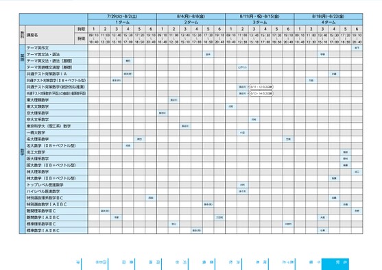 1ターム341ターム〜〜34宮下15:30植田〜17:00森本(将)植田〜森本(将)森本(将)森本(将)高田高田河原河原長谷川長谷川長谷川長谷川長谷川長谷川森本(将)森本(将)市野市野西畑西畑森本(将)森本(将)三田村森本(将)三田村森本(将)谷口谷口河村河村長谷川長谷川長谷川長谷川8/11・12の2日間8/13・14の2日間河村小田河村小田河村佐々木河村佐々木校了時削除大庭大庭水嶋水嶋笠岡笠岡三田村三田村高田野村高田野村後藤水嶋水嶋後藤後藤加藤加藤谷口谷口市野市野大庭大庭小栗●2025年度/夏期講習/中部/名駅校/高3・卒生/パターン34602025_56_4_414_11_20250318184133.csv/1ページ松延金井7/29(火)~8/2(土)8/4(月)~8/8(金)登木127/29(火)~8/2(土)56128/4(月)~8/8(金)258/11(月・祝)~8/15(金)6128/18(月)~8/22(金)宮下5609:1011:0013:4015:3017:2019:1009:1011:0013:4015:3017:2019:1009:1011:0013:4015:3017:2019:1009:1011:0013:4015:30〜1〜〜2〜〜5〜〜6〜〜1〜〜2〜10:4012:3015:1017:0018:5020:4010:4012:3015:1017:0018:5020:4010:4012:3015:1017:0018:5020:4010:4012:3015:1017:0009:1011:0013:4017:2019:1009:1011:0013:4015:3019:1009:1011:0013:4015:3017:2019:1009:1011:0010:4012:3015:1018:5020:4010:4012:3015:1017:0020:4010:40山下(り)12:3015:1017:0018:5020:4010:4012:30校了時削除この色のマスが授業のある時限です。金井山下(り)8/11(月・祝)~8/15(金)●同一名の講は設置校舎・設置期間(ターム)・授業時間(時限)が異なっても同一内容です。●担当講師は変更になる場合がありますので、あらかじめご了承ください。●講師のフルネームはWebサイトでご確認ください。8/18()/22(金)木2ターム342ターム遠藤〜〜34〜〜笹村651〜517:20〜金井18:50〜6〜村瀬〜1〜〜2〜3ターム343ターム〜〜34〜〜〜5〜〜6〜〜1〜〜2〜4ターム344ターム〜〜3417:20〜5登木18:5019:10〜620:4019:10宮下〜20:4013:40〜宇野151015:3017:20〜〜17:0018:50●2025年度/夏期講習/中部/名駅校/高3・卒生/パターン34602025_56_4_414_11_20250318184133.csv/1ページ山下(り)時間時限時間時限国公立大英語私大英語テーマ超長文英語読解(私大)発展]テーマ英文解釈[発展]テーマ英作文[発展]自由英作文講座名テーマ英文解釈テーマ英文法・語法[基礎]テーマ英語構文演習[基礎]テーマ英文法・語法[基礎]テーマ英語構文演習[基礎]通テスト対策数学(ⅡB+ベクトル型)共通テスト対策数学IA(統計的な推測)共通テスト対策数学(ⅡB+ベクトル型)通テスト策数学(平面の曲線と素数平面共通テスト対策数学(統計的な推測)共通テスト対策数学(平面上の曲線と複素数平面)東大文類数学東大理類数学東大文類数学京大文系数学京大理系数学理工系)数学京大文系数学一橋大数学東京科学大(理工系)数学一橋大数学名大数学(ⅡB+ベクトル型)名大理系数学名大数学(ⅡB+ベクトル型)名工大数学ⅡB+ベクトル型)阪大理系数学阪大数学(ⅡB+ベクトル型)神大理系数学医進数学神大数学(ⅡB+ベクトル型)トップレベル医進数学ハイレベル医進数学BC特別選抜理系数学ⅢC特別選抜数学ⅠAⅡBC難関理系数学ⅢC難関数学ⅠAⅡBC標準数学ⅠAⅡBC標準理系数学ⅢC標準数学ⅠAⅡBC教科教科英語英語英語数学数学高3生・高卒生●2025年度/夏期講習/中部/名駅校/高3・卒生/パターン34602025_56_4_414_11_20250318184133.csv/2ページ校了時削除●2025年度/夏期講習/中部/名駅校/高3・卒生/パターン3460津四日市豊田2025_56_4_414_11_20250318184133.csv/2ページ岡崎岐阜浜松豊橋刈谷星ヶ丘校了時削除千種名駅