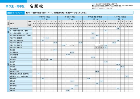 高3生・高卒生名駅校この色のマスが授業のある時限です。●同一名称の講座は設置校舎・設置期間(ターム)・授業時間(時限)が異なっても同一内容です。●担当講師は変更になる場合がありますので、あらかじめご了承ください。●講師のフルネームはWebサイトでご確認ください。豊富なラインアップ!オンライン授業の講座一覧は51ページ、映像授業の講座一覧は54ページをご覧ください。7/29(火)~8/2(土)1ターム431256128/4(月)~8/8(金)2ターム438/11(月・祝)~8/15(金)8/18(月)~8/22(金)56123ターム4356124ターム435609:1011:0013:4015:3017:2019:1009:1011:0013:4015:3017:2019:1009:1011:0013:4015:3017:2019:1009:1011:0013:4015:3017:2019:10〜〜〜〜〜〜〜〜〜〜〜〜〜10:4012:3015:1017:0018:5020:4010:4012:3015:1017:0018:5020:4010:4012:3015:1017:0018:5020:4010:4012:3015:1017:0018:5020:40〜〜〜〜〜〜〜〜〜〜〜河原長谷川長谷川日嵩・伊藤・野村小倉高橋大田・野村山村・野村河合・江平野・井上(摩)・江安達福永・坂下・野村井上(摩)8/4~6の3日間武下・山村武下・坂下7/29~31の3日間高橋武下高橋井上(摩)佐藤(浩)大田井上(摩)8/11~13の3日間井上(摩)8/14・15の2日間江福永・伊藤山村・野村井上(真)齊藤・山村山村野村福永・伊藤平野・山村高橋・山村山村横井講座名時限時間整数問題演習テーマ数学(場合の数と確率)テーマ数学(数列・ベクトル)テーマ数学(複素数平面・2次曲線)共通テスト対策国語共通テスト対策現代文共通テスト対策古典共通テスト対策古文共通テスト対策漢文東大国語京大理系国語京大文系国語一橋大国語名大現代文名大古典阪大国語早大国語南山大国語関関同立大国語難関国公立大現代文(論述対策)難関国公立大古文(論述対策)難関現代文難関古文難関漢文標準現代文標準古文古典文法教科数学国語