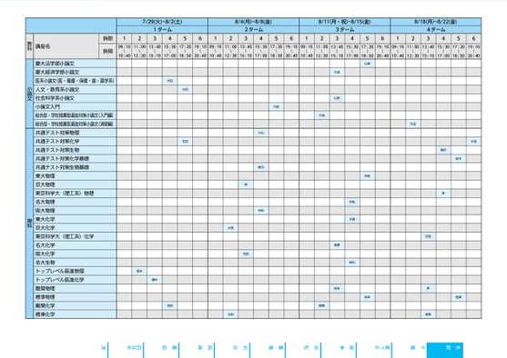 ●2025年度/夏期講習/中部/名駅校/高3・卒生/パターン34602025_56_4_414_11_20250318184133.csv/3ページ校了時削除この色のマスが授業のある時限です。8/11(月・祝)~8/15(金)●同一名の講は設置校舎・設置期間(ターム)・授業時間(時限)が異なっても同一内容です。●担当講師は変更になる場合がありますので、あらかじめご了承ください。●講師のフルネームはWebサイトでご確認ください。8/18()/22(金)3ターム344ターム347/29(火)~8/2(土)1ターム341256128/4(月)~8/8(金)2ターム34561256125609:1011:0013:4015:3017:2019:1009:1011:0013:4015:3017:2019:1009:1011:0013:4015:3017:2019:1009:1011:0013:4015:3017:2019:10〜〜〜〜〜〜〜〜〜〜〜〜〜〜〜〜〜〜〜〜〜〜〜〜10:4012:3015:1017:0018:5020:4010:4012:3015:1017:0018:5020:4010:4012:3015:1017:0018:5020:4010:4012:3015:1017:0018:5020:40大田大田花田坂本瀬木花田小山桝元村松岸花田大髙太田大田大田山田●村松大田山田●青野坂本村松大髙桝元坂本青野大田大宮福井田中岸花田岸若原西浦時限時間高3生・高卒生講座名教科慶大法学部小論文慶大経済学部小論文医系小論文(医・看護・保健・歯・薬学系)人文・教育系小論文社会科学系小論文小論文入門総合型・学校推薦型選抜対策小論文(入門編)総合型・学校推薦型選抜対策小論文(演習編)共通テスト対策物理共通テスト対策化学共通テスト対策生物共通テスト対策化学基礎共通テスト対策生物基礎東大物理京大物理東京科学大(理工系)物理名大物理阪大物理東大化学京大化学東京科学大(理工系)化学名大化学阪大化学名大生物トップレベル医進物理トップレベル医進化学難関物理標準物理難関化学標準化学小論文理科●2025年度/夏期講習/中部/名駅校/高3・卒生/パターン34602025_56_4_414_11_20250318184133.csv/4ページ校了時削除津四日市豊田岡崎刈谷豊橋浜松岐阜星ヶ丘千種名駅