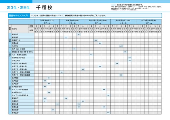 高3生・高卒生千種校この色のマスが授業のある時限です。●同一名称の講座は設置校舎・設置期間(ターム)・授業時間(時限)が異なっても同一内容です。●担当講師は変更になる場合がありますので、あらかじめご了承ください。●講師のフルネームはWebサイトでご確認ください。豊富なラインアップ!オンライン授業の講座一覧は51ページ、映像授業の講座一覧は54ページをご覧ください。7/29(火)~8/2(土)8/4(月)~8/8(金)8/11(月・祝)~8/15(金)8/18(月)~8/22(金)8/25(月)~8/27(水)1ターム431256122ターム4356123ターム4356124ターム4356125ターム435609:1011:0013:4015:3017:2019:1009:1011:0013:4015:3017:2019:1009:1011:0013:4015:3017:2019:1009:1011:0013:4015:3017:2019:1009:1011:0013:4015:3017:2019:10〜〜〜〜〜〜〜〜〜〜〜〜〜〜〜〜〜〜〜〜〜〜〜〜〜〜〜〜〜〜10:4012:3015:1017:0018:5020:4010:4012:3015:1017:0018:5020:4010:4012:3015:1017:0018:5020:4010:4012:3015:1017:0018:5020:4010:4012:3015:1017:0018:5020:40坂下江高橋横井日髙鈴木大宮高森田中井上(摩)大田日髙大田西浦高森坂本福井大髙青野窪田坂本岸西浦大宮福井窪田大髙青野窪田大宮大髙福井講座名時限時間難関古文難関漢文標準現代文標準古文古典文法名大(法)小論文医系小論文(医・看護・保健・歯・薬学系)人文・教育系小論文社会科学系小論文小論文入門共通テスト対策物理共通テスト対策化学共通テスト対策生物共通テスト対策化学基礎共通テスト対策生物基礎名大物理名大化学名大生物名大医進物理トップレベル医進物理名大医進化学トップレベル医進化学難関物理標準物理難関化学標準化学難関生物標準生物教科国語小論文理科
