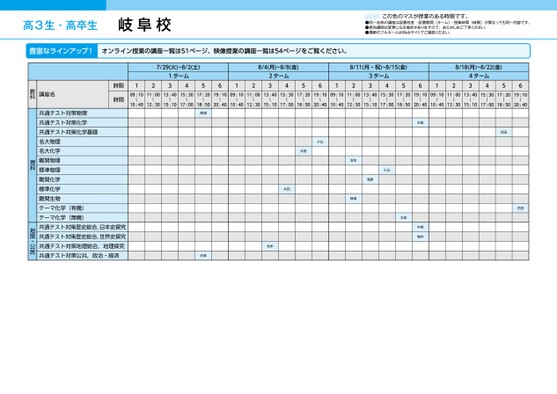 岐阜校オンライン授業の講座一覧は51ページ、映像授業の講座一覧は54ページをご覧ください。齊藤笹森・野村谷口西畑この色のマスが授業のある時限です。笠岡●同一名称の講座は設置校舎・設置期間(ターム)・授業時間(時限)が異なっても同一内容です。●担当講師は変更になる場合がありますので、あらかじめご了承ください。●講師のフルネームはWebサイトでご確認ください。小栗高原7/29(火)~8/2(土)1ターム431256128/4(月)~8/8(金)2ターム438/11(月・祝)~8/15(金)石川8/18(月)~8/22(金)56123ターム43大田56124ターム43佐藤(浩)5609:1011:0013:4015:3017:2019:1009:1011:0013:4015:3017:20〜10:40〜〜〜〜12:307/29(火)~8/2(土)15:1017:0018:50〜〜20:4010:40〜〜〜〜12:308/4(月)~8/8(金)15:1017:0018:5019:10伊藤〜20:4009:1011:0013:4015:3017:2019:1009:1011:0013:4015:3017:2019:10〜10:40〜〜8/11(月・祝)~8/15(金)15:1017:00〜鈴木18:5012:30〜〜〜20:4010:40〜〜〜〜12:308/18(月)~8/22(金)15:1017:0018:50〜20:4011221ターム1ターム3443西浦556611222ターム2ターム3443太田556611坂本223ターム3ターム344355太田6611224ターム4ターム3443556609:1011:0013:4015:3017:2019:1009:1011:0013:4015:3017:20〜〜〜〜〜〜〜〜〜〜〜10:4010:4012:3012:3015:1015:1017:0017:0018:5018:5020:4020:4010:4010:4012:3015:1017:0018:5019:10〜小山20:4009:1011:00〜〜10:4012:3013:40〜若原15:1015:30小山〜17:0017:2019:1009:1011:0013:4015:30〜〜〜〜〜〜18:5020:4010:4012:3015:1017:0017:20花田〜18:5019:10〜20:40時間時限特別選抜理系数学ⅢC特別選抜数学ⅠAⅡBC難関理系数学ⅢC難関数学ⅠAⅡBC標準数学ⅠAⅡBC共通テスト対策現代文豊富なラインアップ!共通テスト対策古典難関国公立大現代文(論述対策)難関現代文難関古文標準古文小論文入門共通テスト対策物理共通テスト対策化学難関物理講座名スト対策化学基礎名大物理名大化学名大化学難関物理標準物理標準物理学(有機)難関化学学(無機)標準化学共通テスト対策歴史総合,日本史探究難関生物通テスト対策歴史総合,世界史探究テーマ化学(有機)共通テスト対策地理総合,地理探究テーマ化学(無機),政治・経済共通テスト対策歴史総合,日本史探究共通テスト対策歴史総合,世界史探究共通テスト対策地理総合,地理探究共通テスト対策公共,政治・経済時限時限時間理科理科教科地歴理科国語理科教科公民小論文地歴・公民地歴公民理科高3生・高卒生学●2025年度/夏期講習/中部/岐阜/高3・卒生/パターン34602025_56_4_412_11_20250314195140.csv/1ページ太田太田坂本榊原太田太田榊原小山若原太田中垣堀井中垣中垣堀井太田日髙日髙松本松本松本校了時削除花田花田花田