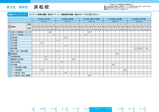 ●2025年度/夏期講習/中部/岐阜/高3・卒生/パターン34602025_56_4_412_11_20250314195140.csv/2ページ高3生・高卒生浜松校校了時削除この色のマスが授業のある時限です。●同一名称の講座は設置校舎・設置期間(ターム)・授業時間(時限)が異なっても同一内容です。●担当講師は変更になる場合がありますので、あらかじめご了承ください。●講師のフルネームはWebサイトでご確認ください。7/29(火)~8/2(土)8/4(月)~8/8(金)8/11(月・祝)~8/15(金)8/18(月)~8/22(金)8/25(月)~8/27(水)1ターム431256122ターム4356123ターム4356124ターム4356125ターム435609:1011:0013:4015:3017:2019:1009:1011:0013:4015:3017:2019:1009:1011:0013:4015:3017:2019:1009:1011:0013:4015:3017:2019:1009:1011:0013:4015:3017:2019:10〜〜〜〜〜〜〜〜〜〜〜〜〜〜〜〜〜〜〜〜〜〜〜〜10:4012:3015:1017:0018:5020:4010:4012:3015:1017:0018:5020:4010:4012:3015:1017:0018:5020:4010:4012:3015:1017:0018:5020:4010:4012:3015:1017:0018:5020:40〜〜〜〜〜〜守屋守屋青木原田百々青木守屋百々笹村桑野桑野笹村笹村原田桑野原田亀山8/27は5限のみ笹村室田原田原田時限時間講座名教科共通テスト対策英語(リーディング)共通テスト対策英語(リスニング)東大英語京大英語名大英語早大英語慶大英語明治・中央・法政大英語医進英語特別選抜英語難関国公立大英語国公立大英語私大英語テーマ英文解釈[発展]テーマ英文解釈テーマ英文法・語法テーマ英文法・語法[基礎]英語●2025年度/夏期講習/中部/岐阜/高3・卒生/パターン3460豊富なラインアップ!オンライン授業の講座一覧は51ページ、映像授業の講座一覧は54ページをご覧ください。2025_56_4_412_11_20250314195140.csv/2ページ校了時削除津四日市豊田岡崎刈谷豊橋浜松岐阜星ヶ丘千種名駅