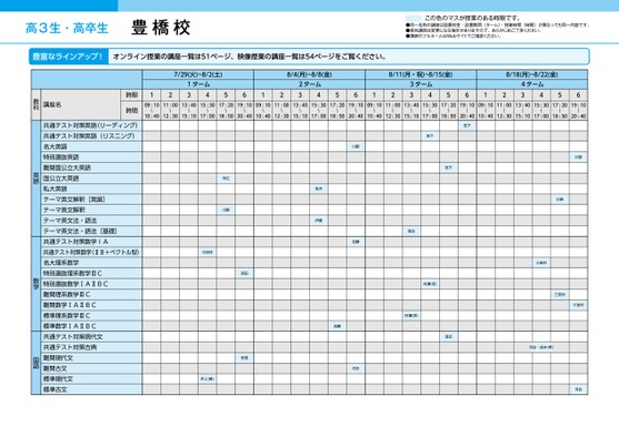 高3生・高卒生豊橋校この色のマスが授業のある時限です。●同一名称の講座は設置校舎・設置期間(ターム)・授業時間(時限)が異なっても同一内容です。●担当講師は変更になる場合がありますので、あらかじめご了承ください。●講師のフルネームはWebサイトでご確認ください。豊富なラインアップ!オンライン授業の講座一覧は51ページ、映像授業の講座一覧は54ページをご覧ください。7/29(火)~8/2(土)1ターム431256128/4(月)~8/8(金)2ターム438/11(月・祝)~8/15(金)8/18(月)~8/22(金)56123ターム4356124ターム435609:1011:0013:4015:3017:2019:1009:1011:0013:4015:3017:2019:1009:1011:0013:4015:3017:2019:1009:1011:0013:4015:3017:2019:10〜〜〜〜〜〜〜〜〜〜〜〜〜10:4012:3015:1017:0018:5020:4010:4012:3015:1017:0018:5020:4010:4012:3015:1017:0018:5020:4010:4012:3015:1017:0018:5020:40〜〜〜〜〜〜〜〜〜〜〜川野宮下宮下宮下川野市位7/29(火)~8/2(土)121ターム345川野6128/4(月)~8/8(金)笠井2ターム348/11(月・祝)~8/15(金)8/18(月)~8/22(金)56123ターム3456124ターム34川野5609:1011:0013:4015:3017:2019:1009:1011:0013:40〜〜〜〜〜〜〜〜〜10:4012:3015:1017:0018:5020:4010:4012:3015:1015:30伊藤〜17:0017:2019:1009:1011:00〜〜〜18:5020:4010:4012:30〜13:40〜落合15:1015:3017:2019:1009:1011:0013:4015:3017:2019:10〜〜〜〜〜〜〜〜〜17:0018:5020:4010:4012:3015:1017:0018:5020:40三田村三田村井上(真)宮田安達宮田市位川野齋藤加藤川野加藤河合笠井伊藤加藤宮下宮下村瀬(宗)宮下村瀬(宗)落合渡辺村瀬(宗)村瀬(宗)岸荒木三田村川野三田村三田村川野河合・鈴木(孝)三田村中村三田村河合三田村時限時間講座名教科時限時間共通テスト対策英語(リーディング)共通テスト対策英語(リスニング)名大英語特別選抜英語難関国公立大英語国公立大英語私大英語テーマ英文解釈[発展]テーマ英文解釈講座名テーマ英文法・語法テーマ英文法・語法[基礎]共通テスト対策英語(リーディング)共通テスト対策数学IA共通テスト対策英語(リスニング)共通テスト対策数学(ⅡB+ベクトル型)名大英語名大理系数学特別選抜英語特別選抜理系数学ⅢC難関国公立大英語特別選抜数学ⅠAⅡBC国公立大英語難関理系数学ⅢC私大英語難関数学ⅠAⅡBCテーマ英文解釈[発展]標準理系数学ⅢCテーマ英文解釈標準数学ⅠAⅡBCテーマ英文法・語法共通テスト対策現代文テーマ英文法・語法[基礎]共通テスト対策古典共通テスト対策数学IA難関現代文共通テスト対策数学(ⅡB+ベクトル型)難関古文名大理系数学標準現代文特別選抜理系数学ⅢC標準古文特別選抜数学ⅠAⅡBC共通テスト対策化学難関理系数学ⅢC難関物理難関数学ⅠAⅡBC標準物理標準理系数学ⅢC難関化学標準数学ⅠAⅡBC英語教科数学英語国語数学理科