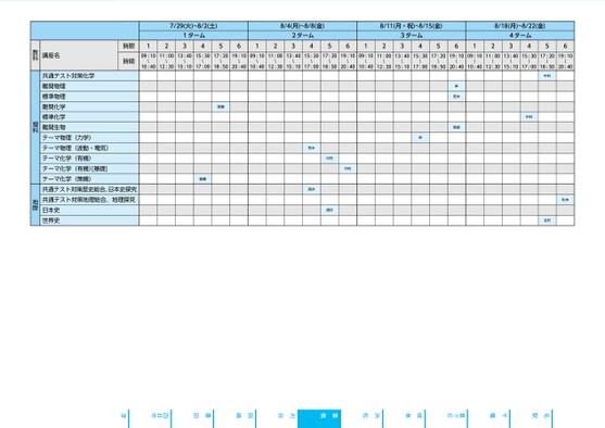 ●2025年度/夏期講習/中部/豊橋/高3・卒生/パターン34602025_56_4_411_11_20250314195140.csv/1ページ校了時削除この色のマスが授業のある時限です。渡辺7/29(火)~8/2(土)7/29(火)~8/2(土)1ターム341ターム34〜〜121〜〜2〜〜10:4012:301215:10〜〜1ターム3417:0009:1011:0013:4015:30井上()17:2019:1009:1011:0013:4015:3017:2019:1009:1010:4009:1012:3011:007/29(火)~8/2(土)15:1013:4017:015:3018:5017:2020:4019:1010:4009:1012:3011:008/4(月)~8/8(金)151013:4070015:3018:5017:2020:4019:1010:4009:10安達65125〜〜6〜〜1〜〜2〜〜18:5020:4010:4012:3056128/4(月)~8/8(金)8/4(月)~8/8(金)2ターム342ターム34〜〜15:10〜〜2ターム3417:00●同一名称の講座は設置校舎・設置期間(ターム)・授業時間(時限)が異なっても同一内容です。●担当講師は変更になる場合がありますので、あらかじめご了承ください。●講師のフルネームはWebサイトでご確認ください。8/18()/22(金)8/18(月)~8/22(金)河合・(孝)8/11(月・祝~8/5(金)8/11(月・祝)~8/15(金)523ターム343ターム34〜〜11:0017:2013:4015:3052〜〜8/11(月・祝)~8/15(金)〜〜15:1013:4017:0015:3018:5017:2012:3011:0015:10〜〜3ターム3417:004ターム344ターム34〜〜6126〜〜1〜〜2〜〜19:1009:1011:0013:4015:3017:2019:1020:4019:1010:4009:1012:3011:008/18(月)~8/22(金)15:1013:4017:0015:3018:5017:2020:4019:1018:5020:4010:4012:305高森岸61215:10〜〜4ターム中村34中村17:00〜中村18:5020:4056565〜6〜河合〜5河合616〜〜1〜〜18:5020:4010:4012:30561209:1011:0013:4015:30〜〜〜10:4012:3015:1017:00〜17:20〜齋藤18:5019:1009:1011:0013:40〜〜〜〜20:4010:4012:3015:1015:30〜荒木17:0017:2019:1009:1011:0013:4015:3017:20〜〜〜〜18:5020:4010:4012:3015:1017:0018:50岸〜岸〜19:10荒木高森〜20:4009:1011:0013:4015:3017:2019:10〜〜〜〜〜〜10:4012:3015:1017:0018:5020:40加藤5〜〜〜中村中村●2025年度/夏期講習/中部/豊橋/高3・卒生/パターン34602025_56_4_411_11_20250314195140.csv/1ページ荒木中村高森齋藤齋藤齋藤岸中村中村荒木酒井酒井中村酒井酒井酒井時限時限時限時間時間標準数学ⅠAⅡBC共通テスト対策現代文共通テスト対策古典難関現代文難関古文標準現代文講座名標準古文講座名共通テスト対策化学難関物理標準化学講座名理理(力学)難関生物難関化学理(波動・電気)テーマ物理(力学)標準化学学(有機)テーマ物理(波動・電気)難関生物テーマ化学(有機)[基礎]テーマ化学(有機)テーマ物理(力学)テーマ化学(有機)[基礎]テーマ物理(波動・電気)共通テスト対策歴史総合,日本史探究テーマ化学(無機)テーマ化学(有機)総合,地理探究共通テスト対策歴史総合,日本史探究テーマ化学(有機)[基礎]日本史共通テスト対策地理総合,地理探究テーマ化学(無機)日本史共通テスト対策歴史総合,日本史探究世界史共通テスト対策地理総合,地理探究日本史世界史時間国語教科教科理科科理科理科理科地歴地歴地歴理科高3生・高卒生校了時削除中村松本松本松本北村北村北村校了時削除校了時削除千種名駅●2025年度/夏期講習/中部/豊橋/高3・卒生/パターン3460●2025年度/夏期講習/中部/豊橋/高3・卒生/パターン3460津四日市豊田2025_56_4_411_11_20250314195140.csv/2ページ2025_56_4_411_11_20250314195140.csv/2ページ岡崎岐阜浜松豊橋刈谷星ヶ丘●2025年度/夏期講習/中部/豊橋/高3・卒生/パターン34602025_56_4_411_11_20250314195140.csv/2ページ校了時削除