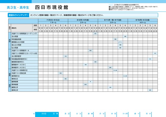 ●2025年度/夏期講習/中部/豊田/高3・卒生/パターン35602025_56_4_449_11_20250318184133.csv/1ページ高3生・高卒生四日市現役館校了時削除この色のマスが授業のある時限です。●同一名称の講座は設置校舎・設置期間(ターム)・授業時間(時限)が異なっても同一内容です。●担当講師は変更になる場合がありますので、あらかじめご了承ください。●講師のフルネームはWebサイトでご確認ください。7/29(火)~8/2(土)1ターム431256128/4(月)~8/8(金)2ターム438/11(月・祝)~8/15(金)8/18(月)~8/22(金)56123ターム4356124ターム435609:3011:2013:5015:4017:3019:2009:3011:2013:5015:4017:3019:2009:3011:2013:5015:4017:3019:2009:3011:2013:5015:4017:3019:20〜〜〜〜〜〜〜〜〜〜〜〜〜11:0012:5015:2017:1019:0020:5011:0012:5015:2017:1019:0020:5011:0012:5015:2017:1019:0020:5011:0012:5015:2017:1019:0020:50〜〜〜〜〜〜〜〜〜〜〜渡辺西畑西畑三輪岸西浦渡邉伊藤山下(り)伊藤渡邉高原井上(真)花田井上(真)大庭笹森笹森竹内竹内若原時限時間講座名教科共通テスト対策英語(リーディング)名大英語特別選抜英語難関国公立大英語国公立大英語私大英語共通テスト対策数学IA共通テスト対策数学(ⅡB+ベクトル型)名大理系数学特別選抜理系数学ⅢC難関理系数学ⅢC難関数学ⅠAⅡBC標準数学ⅠAⅡBC共通テスト対策現代文共通テスト対策古典標準現代文標準古文難関物理標準物理難関化学標準化学英語数学国語理科豊富なラインアップ!オンライン授業の講座一覧は51ページ、映像授業の講座一覧は54ページをご覧ください。津四日市豊田岡崎刈谷豊橋浜松岐阜星ヶ丘千種名駅