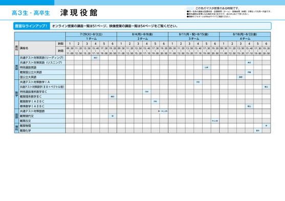 高3生・高卒生津現役館この色のマスが授業のある時限です。●同一名称の講座は設置校舎・設置期間(ターム)・授業時間(時限)が異なっても同一内容です。●担当講師は変更になる場合がありますので、あらかじめご了承ください。●講師のフルネームはWebサイトでご確認ください。豊富なラインアップ!オンライン授業の講座一覧は51ページ、映像授業の講座一覧は54ページをご覧ください。7/29(火)~8/2(土)1ターム431256128/4(月)~8/8(金)2ターム438/11(月・祝)~8/15(金)8/18(月)~8/22(金)56123ターム4356124ターム435609:3011:2013:5015:4017:3019:2009:3011:2013:5015:4017:3019:2009:3011:2013:5015:4017:3019:2009:3011:2013:5015:4017:3019:20〜〜〜〜〜〜〜〜〜〜〜〜〜11:0012:5015:2017:1019:0020:5011:0012:5015:2017:1019:0020:5011:0012:5015:2017:1019:0020:5011:0012:5015:2017:1019:0020:50〜〜〜〜〜〜〜〜〜〜〜渡辺嶋田岡河村河村岡・井上(淳)山岸河合井上(淳)桑野渡辺伊藤鷲山鷲山岸冨永講座名時限時間共通テスト対策英語(リーディング)共通テスト対策英語(リスニング)特別選抜英語難関国公立大英語国公立大英語共通テスト対策数学IA共通テスト対策数学(ⅡB+ベクトル型)特別選抜理系数学ⅢC難関理系数学ⅢC難関数学ⅠAⅡBC標準数学ⅠAⅡBC共通テスト対策国語難関現代文難関古文難関物理難関化学教科英語数学国語理科
