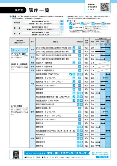【ダイジェスト】夏から始める入試対策英語(特別選抜・難関)【ダイジェスト】夏から始める入試対策英語(難関・標準)【ダイジェスト】夏から始める入試対策数学(特別選抜・難関)【ダイジェスト】夏から始める入試対策数学(難関・標準)共通テスト対策英語共通テスト対策数学共通テスト対策現代文特別選抜英語(ONEWEX)難関英語―トップレベル―難関英語―トップ・ハイレベル―難関英語―ハイレベル―難関英語標準英語特別選抜理系数学中高一貫(ONEWEX)特別選抜数学(ONEWEX)難関理系数学中高一貫難関数学中高一貫数学難関数学―トップレベル―難関数学―トップ・ハイレベル―難関数学―ハイレベル―難関数学標準数学特別選抜国語(ONEWEX)【現2講・古2講・漢1講】難関現代文国語難関古文標準現代文標準古文対映講座レベル標準12難関34特別選抜56授業時間90分90分90分90分90分90分90分90分90分90分90分90分90分90分90分90分90分90分90分90分90分90分90分90分90分90分90分講数2講2講2講2講2講2講2講5講5講5講5講5講5講5講5講5講5講5講5講5講5講5講5講5講5講5講5講対対対対映映映対対対映対映対映対映対映映対対対映対映対映対映対映対映対映講座名授業形式▶夏期講習を受講するために「認定テスト」を受ける必要はありません。現在の学力や学習状況にあわせて講座を選択できます。●マーク採点・添削ありリスニングあり対対面授業映映像授業オオンライン授業デジタル端末などを使ってオンライン上で受講できるライブ型の授業です。*オンライン授業の詳細は51ページをご覧ください。*映像授業の申し込み・受講方法は53ページをご覧ください。563412特別選抜難関標準受講の目安偏差値65.0〜目標大学:東大・京大・医学部医学科受講の目安偏差値55.0〜目標大学:名大・難関国公立大・早慶大など受講の目安偏差値〜54.9目標大学:国公立大・私立大●講座レベル※受講の目安偏差値は、河合塾全統模試における偏差値です。数字が大きいほど難度が高く、入試難易度の高い大学をめざす方向けの講座です。高2生講座一覧講座内容・お申し込みはこちら▶講座種類(講座のねらい)夏トクキャンペーンダイジェスト講座1学期の重要テーマを、短期間で習得できる講座です。共通テスト対策講座この夏から対策を行い、大学入学共通テストで高得点をめざす講座です。教科英語数学英語数学国語英語レベル別講座学力をレベルアップさせたい方を対象とした講座です。レベル別に講座が設置されていますので、自分に最適な講座を選ぶことができます。超トップレベル生専用東海・南山女子エンリッチコース東海・南山女子生のための速習カリキュラム(定員制)◆高2エンリッチ英語◆高2エンリッチ数学*詳細は、千種校までお問い合わせください。千種校のみ設置