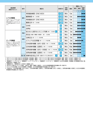 講座レベル標準12難関34特別選抜56講座種類(講座のねらい)レベル別講座学力をレベルアップさせたい方を対象とした講座です。レベル別に講座が設置されていますので、自分に最適な講座を選ぶことができます。テーマ別講座特定のテーマ・分野について学習する講座です。得意分野の更なる強化や苦手分野の克服など、自分の目的に応じて講座を選ぶことができます。教科理科地歴英語国語地歴講座名特別選抜物理(ONEWEX)難関物理(高1・2生共通)特別選抜化学(ONEWEX)難関化学(高1・2生共通)日本史世界史知らないと損するリスニング対策(高1・2生共通)英文法-動詞・準動詞・関係詞-(高1・2生共通)古典文法(高1・2・3・卒生共通)ビジュアル古文常識(高1・2・3・卒生共通)日本史集中講義(古代ー近世)(高2・3・卒生共通)日本史集中講義(近現代)(高2・3・卒生共通)世界史集中講義(古代ー18世紀)(高2・3・卒生共通)世界史集中講義(近現代)(高2・3・卒生共通)英語/数学答案作成力向上ラボ-全国のライバルと高め合おう-授業形式対映対映対映対映対対対対対映対映対対映対オ授業時間90分90分90分90分90分90分90分90分90分90分90分90分90分90分90分講数5講5講5講5講5講5講2講3講5講2講10講10講10講10講2講*「【ダイジェスト】夏から始める入試対策英語(特別選抜・難関)」、「【ダイジェスト】夏から始める入試対策英語(難関・標準)」は内容が一部重複します。*「【ダイジェスト】夏から始める入試対策数学(特別選抜・難関)」、「【ダイジェスト】夏から始める入試対策数学(難関・標準)」は内容が一部重複します。*「難関数学-トップレベル-」、「難関数学-トップ・ハイレベル-」、「難関数学-ハイレベル-」、「難関数学」は2024年度夏期・冬期講習「高1難関数学中高一貫」の講座内容と一部重複します。*「難関現代文」、「標準現代文」は内容が一部重複します。*「知らないと損するリスニング対策」、「英文法-動詞・準動詞・関係詞-」は2024年度夏期講習の同名講座と同一内容です。*「ビジュアル古文常識」は2024年度夏期・冬期講習、2025年度春期講習の同名講座と同一内容です。*「古典文法」、「日本史集中講義(古代ー近世)」、「日本史集中講義(近現代)」、「世界史集中講義(古代ー18世紀)」、「世界史集中講義(近現代)」は2024年度夏期・冬期講習の同名講座と同一内容です。