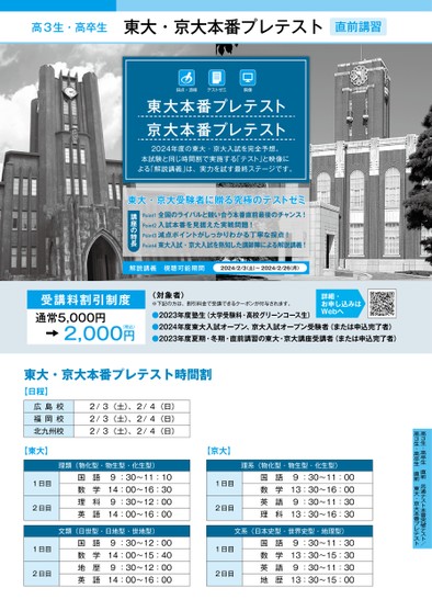 高3生・高卒生東大・京大本番プレテスト直前講習採点・添削テストゼミ映像東大本番プレテスト京大本番プレテスト2024年度の東大・京大入試を完全予想。本試験と同じ時間割で実施する「テスト」と映像による「解説講義」は、実力を試す最終ステージです。東大・京大受験者に贈る究極のテストゼミPoint1全国のライバルと競い合う本番直前最後のチャンス!Point2入試本番を見据えた実戦問題!Point3減点ポイントがしっかりわかる丁寧な採点!Point4東大入試・京大入試を熟知した講師陣による解説講義!講座の特長解説講義視聴可能期間2024/2/3(土)〜2024/2/26(月)受講料割引制度通常5,000円→2,000円(税込)〈対象者〉※下記の方は、割引料金で受講できるクーポンが付与されます。詳細・お申し込みはWebへ●2023年度塾生(大学受験科・高校グリーンコース生)●2024年度東大入試オープン、京大入試オープン受験者(または申込完了者)●2023年度夏期・冬期・直前講習の東大・京大講座受講者(または申込完了者)高3生・高卒生高3生・高卒生直前直前共通テスト本番突破テスト/東大・京大本番プレテスト東大・京大本番プレテスト時間割【日程】島岡校広福校北九州校【東大】2/3(土)、2/4(日)2/3(土)、2/4(日)2/3(土)、2/4(日)【京大】理類(物化型・物生型・化生型)理系(物化型・物生型・化生型)国語9:30~11:10数学14:00~16:30理科9:30~12:00英語14:00~16:001日目2日目国語9:30~11:00数学13:30~16:00英語9:30~11:30理科13:30~16:30文類(日世型・日地型・世地型)文系(日本史型・世界史型・地理型)国語9:30~12:00数学14:00~15:40地歴9:30~12:00英語14:00~16:001日目2日目国語9:30~11:30数学13:30~15:30英語9:30~11:30地歴13:30~15:001日目2日目1日目2日目