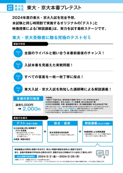 直前講習高3生高卒生東大・京大本番プレテスト2024年度の東大・京大入試を完全予想。本試験と同じ時間割で実施するオリジナルの「テスト」と映像授業による「解説講義」は、実力を試す最終ステージです。東大・京大受験者に贈る究極のテストゼミ講座の特長Point1Point2Point3Point4全国のライバルと競い合う本番前最後のチャンス!入試本番を見据えた実戦問題!すべての答案を一枚一枚丁寧に採点!東大入試・京大入試を熟知した講師陣による解説講義!受講料割引制度通常5,000円→2,000円〈対象者〉一般生で下記の方は、割引料金で受講できるクーポンが付与されます。●2024年度東大・京大入試オープン受験者(または申込完了者)●2023年度夏期・冬期・直前講習の東大・京大講座受講者(または申込完了者)お申し込みにあたっては、上記の割引対象となる申し込みをされた際のログインⅠDでお申し込みください。申込マイページの「>特典・クーポンを確認する」画面で割引料金のクーポンを確認できます。クーポンの付与を確認できない場合は、受講を希望する校舎窓口へお申し出ください。※2023年度河合塾生は、塾生料金2,000円が適用されます。講座の仕組みテスト(校舎で受験)●入試本番と同じ時間割でテストを実施※電子採点を予定しています。テスト当日にタブレット・スマートフォンをご持参ください。●解答・解説の配付採点・返却解説講義(Webで視聴)+採点済答案を後日返却※返却方法はテスト当日にご案内します。+映像授業による解説講義※解説講義はインターネットで視聴できます。詳しくはテスト当日にご案内します。解説講義は大問別に視聴できるので、見たい問題の解説を効率よく確認できます。また、全国の受験者の平均点も公開されます。視聴方法など詳細はテスト当日にご案内します。Web視聴可能期間▶2024/2/2(金)〜2024/2/26(月)〈視聴について〉※視聴にはログインする必要があります。※タブレット・スマートフォン、パソコンなどからインターネットをご利用になれない場合の視聴方法は、テスト当日にご案内します。