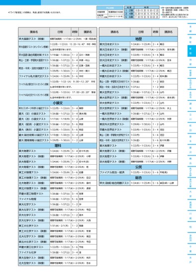 ▶同一名称の講座は設置校舎・設置期間・授業時間(時限)が異なっても同一内容です。▶担当講師は変更になる場合がありますので、あらかじめご了承ください。*「ライブ配信型」の授業は、見逃し配信でも受講いただけます。対面授業受講開始の4日前2024/2/11(日・祝)申込期限映像授業・オンライン授業時限時間1・2限3・4限5・6限9:00〜10:30・10:50〜12:2013:20〜14:50・15:10〜16:4017:00〜18:30・18:50〜20:20本郷麹町新宿池袋秋葉原自由が丘吉祥寺調布立川町田厚木藤沢横浜あざみ野金沢文庫大宮南浦和川越柏津田沼千葉水戸講座名日程時限講師名講座名日程時限講師名早大国語テスト(映像)視聴可能期間:1/17(水)〜2/29(木)一瀬・阿部(順)地歴早大国語テスト(オンライン授業)1/22(月)・1/23火)13:20〜16:40*木村・隼坂東大日本史テスト1/24(水)・1/25(木)3・4梶沼!途中休憩があります。東大日本史テスト(映像)視聴可能期間:1/17(水)〜2/29(木)坂本(勝)早大国語(融合問題対策)テスト1/19(金)・1/20(土)1・2立川・宮崎京大日本史テスト1/22(月)・1/23(火)5・6梶沼青山・立教・学習院大国語テスト1/26(金)・1/27(土)3・4兵頭・村山京大日本史テスト(映像)視聴可能期間:1/17(水)〜2/29(木)宮本明治・中央・法政大国語テスト1/26(金)・1/27(土)3・4白旗・宮崎一橋大日本史テスト1/22(月)・1/23(火)3・4梶沼1/29(月)・1/30(火)1・2木村・貴川一橋大日本史テスト(映像)視聴可能期間:1/17(水)〜2/29(木)梶沼ファイナル私大現代文テスト1/24(水)・1/25(木)5・6木村早慶大日本史テスト1/22(月)・1/23(火)3・4坂本(勝)ファイナル私大現代文テスト(オンライン授業)ファイナル私大古文テスト(オンライン授業)1/22(月)・1/23(火)9:00〜12:20*木村青山・立教・学習院大日本史テスト1/26(金)!途中休憩があります。明治・中央・法政大日本史テスト1/27(土)1・2依田1・2依田1/22(月)・1/23(火)17:00〜20:20*隼坂東大世界史テスト1/26(金)・1/27(土)5・6山内!途中休憩があります。小論文東大世界史テスト(映像)視聴可能期間:1/17(水)〜2/29(木)坂本(新)京大世界史テスト1/22(月)・1/23(火)1・2山内早大(スポーツ科学)小論文テスト1/22(月)・1/23(火)3・4陣野京大世界史テスト(映像)視聴可能期間:1/17(水)〜2/29(木)井上慶大(文)小論文テスト1/26(金)・1/27(土)3・4清水(唯)一橋大世界史テスト1/26(金)・1/27(土)3・4山内慶大(法)小論文テスト1/17(水)・1/18(木)3・4山家一橋大世界史テスト(映像)視聴可能期間:1/17(水)〜2/29(木)矢野慶大(経済)小論文テスト1/26(金)・1/27(土)5・6飛田東京外大世界史テスト1/29(月)・1/30(火)1・2山内慶大(商B)小論文テスト1/22(月)・1/23(火)5・6飛田早慶大世界史テスト1/22(月)・1/23(火)3・4沼田慶大(総合政策)小論文テスト1/19(金)・1/20(土)3・4山家慶大(環境情報)小論文テスト1/29(月)・1/30(火)1・2山家理科青山・立教・学習院大世界史テスト1/22(月)明治・中央・法政大世界史テスト1/26(金)5・6沼田5・6佐々木(尊)東大地理テスト1/22(月)・1/23(火)3・4伊藤東大物理テスト1/24(水)・1/25(木)3・4佐々木(史)東大地理テスト(映像)視聴可能期間:1/17(水)〜2/29(木)伊藤東大物理テスト(映像)視聴可能期間:1/17(水)〜2/29(木)小野京大地理テスト1/22(月)・1/23(火)5・6伊藤京大物理テスト1/24(水)・1/25(木)1・2佐々木(史)京大地理テスト(映像)視聴可能期間:1/17(水)〜2/29(木)河野京大物理テスト(映像)視聴可能期間:1/17(水)〜2/29(木)乾公民東工大物理テスト1/24(水)・1/25(木)5・6加藤ファイナル政治・経済1/22(月)・1/23(火)5・6平尾(則)東工大物理テスト(映像)視聴可能期間:1/17(水)〜2/29(木)田辺総合北大物理テスト(映像)視聴可能期間:1/17(水)〜2/29(木)島村早大(政経)総合問題テスト1/24(水)・1/25(木)5・6柴田(卓)・山家東北大物理テスト(映像)視聴可能期間:1/17(水)〜2/29(木)渡部早慶大理工物理テスト1/26(金)・1/27(土)3・4宮原ファイナル物理東大化学テスト1/26(金)・1/27(土)5・6宮原1/26(金)・1/27(土)1・2沖東大化学テスト(映像)視聴可能期間:1/17(水)〜2/29(木)寺田京大化学テスト1/26(金)・1/27(土)1・2髙木京大化学テスト(映像)視聴可能期間:1/17(水)〜2/29(木)大西東工大化学テスト1/31(水)・2/1(木)1・2岡島東工大化学テスト(映像)視聴可能期間:1/17(水)〜2/29(木)安達北大化学テスト(映像)視聴可能期間:1/17(水)〜2/29(木)高田東北大化学テスト(映像)視聴可能期間:1/17(水)〜2/29(木)寺田早慶大理工化学テスト1/22(月)・1/23(火)5・6今枝ファイナル化学1/26(金)・1/27(土)3・4金東大生物テスト(映像)視聴可能期間:1/17(水)〜2/29(木)向井北大生物テスト(映像)視聴可能期間:1/17(水)〜2/29(木)志水2ページ●2023年度/直前講習/東日本/新宿/高3・卒生/パターン7043/2023_59_3_329_11_20230808105054.csv/0高31校了時削除