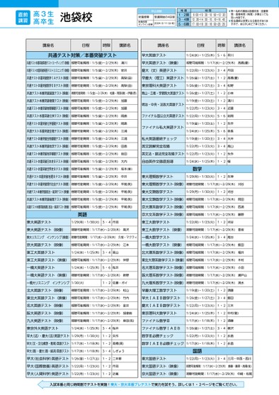 時限時間1・2限3・4限5・6限9:00〜10:30・10:50〜12:2013:20〜14:50・15:10〜16:4017:00〜18:30・18:50〜20:20▶同一名称の講座は設置校舎・設置期間・授業時間(時限)が異なっても同一内容です。▶担当講師は変更になる場合がありますので、あらかじめご了承ください。高3生高卒生直前講習対面授業受講開始の4日前2024/2/11(日・祝)申込期限映像授業・オンライン授業池袋校講座名日程時限講師名講座名日程時限講師名共通テスト対策/本番突破テスト共通テスト本番突破英語テスト(リーディング)映像)視聴可能期間:1/5(金)〜2/29(木)共通テスト本番突破英語テスト(リスニング)映像)視聴可能期間:1/5(金)〜2/29(木)清川安井早大英語テスト1/24(水)・1/25(木)5・6早川早大英語テスト(映像)視聴可能期間:1/17(水)〜2/29(木)髙橋(慶)慶大(文)英語テスト1/22(月)・1/23(火)3・4丹羽共通テスト本番突破数学ⅠAテスト(映像)視聴可能期間:1/5(金)〜2/29(木)高梨(由)早慶大(理工)英語テスト1/26(金)・1/27(土)1・2髙橋(慶)共通テスト本番突破数学ⅡBテスト(映像)視聴可能期間:1/5(金)〜2/29(木)高梨(由)東京理科大英語テスト1/26(金)・1/27(土)3・4松野共通テスト本番突破国語テスト(映像)視聴可能期間:1/5(金)〜2/29(木)松藤・阿部(順)・伊藤(恭)青山・立教・学習院大英語テスト1/26(金)・1/27(土)1・2小林共通テスト本番突破物理テスト(映像)視聴可能期間:1/5(金)〜2/29(木)共通テスト本番突破物理基礎テスト(映像)視聴可能期間:1/5(金)〜2/29(木)共通テスト本番突破化学テスト(映像)視聴可能期間:1/5(金)〜2/29(木)共通テスト本番突破化学基礎テスト(映像)視聴可能期間:1/5(金)〜2/29(木)共通テスト本番突破生物テスト(映像)視聴可能期間:1/5(金)〜2/29(木)共通テスト本番突破生物基礎テスト(映像)視聴可能期間:1/5(金)〜2/29(木)共通テスト本番突破地学テスト(映像)視聴可能期間:1/5(金)〜2/29(木)共通テスト本番突破地学基礎テスト(映像)視聴可能期間:1/5(金)〜2/29(木)共通テスト本番突破日本史Bテスト(映像)視聴可能期間:1/5(金)〜2/29(木)加藤加藤岡島岡島三浦三浦田島前田大内共通テスト本番突破世界史Bテスト(映像)視聴可能期間:1/5(金)〜2/29(木)坂本(新)明治・中央・法政大英語テスト1/19(金)・1/20(土)1・2清川1/22(月)・1/23(火)3・4近藤ファイナル国公立大英語テスト1/22(月)・1/23(火)5・6岩間ファイナル私大英語テスト1/19(金)・1/20(土)1・2矢作1/24(水)・1/25(木)5・6幸長私大英語最終チェック1/19(金)・1/20(土)3・4大井英文読解完全攻略1/22(月)・1/23(火)3・4高山英文法・語法完全攻略テスト1/22(月)・1/23(火)1・2矢作自由英作文徹底指導1/24(水)・1/25(木)1・2幅数学共通テスト本番突破地理Bテスト(映像)視聴可能期間:1/5(金)〜2/29(木)中井東大理類数学テスト1/29(月)・1/30(火)1・2矢神共通テスト本番突破現代社会テスト(映像)視聴可能期間:1/5(金)〜2/29(木)平尾(則)東大理類数学テスト(映像)視聴可能期間:1/17(水)〜2/29(木)刈谷共通テスト本番突破政治・経済テスト(映像)視聴可能期間:1/5(金)〜2/29(木)平尾(則)東大文類数学テスト1/29(月)・1/30(火)1・2刈谷共通テスト本番突破倫理テスト(映像)視聴可能期間:1/5(金)〜2/29(木)平尾(則)東大文類数学テスト(映像)視聴可能期間:1/17(水)〜2/29(木)共通テスト本番突破倫理,政治・経済テスト(映像)視聴可能期間:1/5(金)〜2/29(木)平尾(則)京大理系数学テスト(映像)視聴可能期間:1/17(水)〜2/29(木)英語京大文系数学テスト(映像)視聴可能期間:1/17(水)〜2/29(木)岡田西浦藤野東大英語テスト1/29(月)・1/30(火)3・4丹羽東工大数学テスト1/22(月)・1/23(火)1・2刈谷東大英語テスト(映像)視聴可能期間:1/17(水)〜2/29(木)高沢東工大数学テスト(映像)視聴可能期間:1/17(水)〜2/29(木)香坂東大リスニングインテンシブ(映像)視聴可能期間:1/17(水)〜2/29(木)久恒・マクフィ一橋大数学テスト1/24(水)・1/25(木)3・4尾台京大英語テスト(映像)視聴可能期間:1/17(水)〜2/29(木)江本一橋大数学テスト(映像)視聴可能期間:1/17(水)〜2/29(木)飯田東工大英語テスト1/24(水)・1/25(木)3・4高山北大理系数学テスト(映像)視聴可能期間:1/17(水)〜2/29(木)東工大英語テスト(映像)視聴可能期間:1/17(水)〜2/29(木)仲野東北大理系数学テスト(映像)視聴可能期間:1/17(水)〜2/29(木)一橋大英語テスト1/24(水)・1/25(木)5・6桜井名大理系数学テスト(映像)視聴可能期間:1/17(水)〜2/29(木)福井木村小田一橋大英語テスト(映像)視聴可能期間:1/17(水)〜2/29(木)新野阪大理系数学テスト(映像)視聴可能期間:1/17(水)〜2/29(木)瀬戸山一橋大リスニングインテンシブ1/30(火)1・2佐藤・ガイ九大理系数学テスト(映像)視聴可能期間:1/17(水)〜2/29(木)清水北大英語テスト(映像)視聴可能期間:1/17(水)〜2/29(木)松山早慶大理工数学テスト1/19(金)・1/20(土)1・2須藤東北大英語テスト(映像)視聴可能期間:1/17(水)〜2/29(木)竹内早大ⅠAⅡB数学テスト1/26(金)・1/27(土)3・4飯田名大英語テスト(映像)視聴可能期間:1/17(水)〜2/29(木)金井慶大ⅠAⅡB数学テスト1/22(月)・1/23(火)1・2三木阪大英語テスト(映像)九大英語テスト(映像)視聴可能期間:1/17(水)〜2/29(木)胡摩﨑東京理科大数学テスト1/24(水)・1/25(木)1・2中村(敬)視聴可能期間:1/17(水)〜2/29(木)柴田(祐)フ