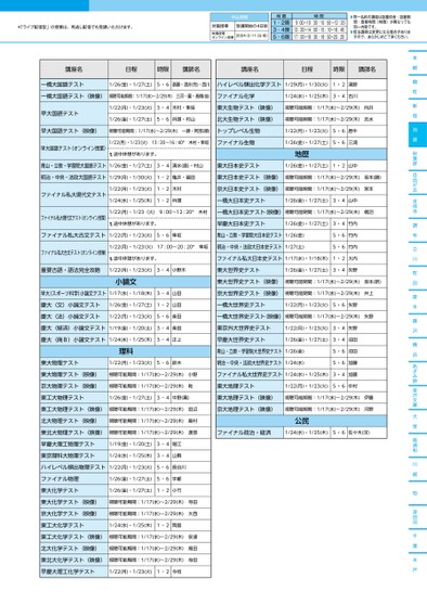 ▶同一名称の講座は設置校舎・設置期間・授業時間(時限)が異なっても同一内容です。▶担当講師は変更になる場合がありますので、あらかじめご了承ください。*「ライブ配信型」の授業は、見逃し配信でも受講いただけます。対面授業受講開始の4日前2024/2/11(日・祝)申込期限映像授業・オンライン授業時限時間1・2限3・4限5・6限9:00〜10:30・10:50〜12:2013:20〜14:50・15:10〜16:4017:00〜18:30・18:50〜20:20本郷麹町新宿池袋秋葉原自由が丘吉祥寺調布立川町田厚木藤沢横浜あざみ野金沢文庫大宮南浦和川越柏津田沼千葉水戸講座名日程時限講師名講座名日程時限講師名一橋大国語テスト1/26(金)・1/27(土)5・6斎藤・酒井(完)・西川ハイレベル頻出化学テスト1/29(月)・1/30(火)1・2清野一橋大国語テスト(映像)視聴可能期間:1/17(水)〜2/29(木)三河・園・髙橋(佳)ファイナル化学1/24(水)・1/25(木)3・4古川早大国語テスト1/22(月)・1/23(火)3・4木村・隼坂東大生物テスト(映像)視聴可能期間:1/17(水)〜2/29(木)向井1/26(金)・1/27(土)5・6兵頭・村山北大生物テスト(映像)視聴可能期間:1/17(水)〜2/29(木)志水早大国語テスト(映像)視聴可能期間:1/17(水)〜2/29(木)一瀬・阿部(順)早大国語テスト(オンライン授業)1/22(月)・1/23火)13:20〜16:40*木村・隼坂!途中休憩があります。トップレベル生物ファイナル生物1/22(月)・1/23(火)5・6唐牛1/26(金)・1/27(土)5・6三浦地歴青山・立教・学習院大国語テスト1/26(金)・1/27(土)3・4清水(直)・村山東大日本史テスト1/26(金)・1/27(土)1・2山中明治・中央・法政大国語テスト1/29(月)・1/30(火)1・2亀井・福田東大日本史テスト(映像)視聴可能期間:1/17(水)〜2/29(木)坂本(勝)ファイナル私大現代文テスト1/22(月)・1/23(火)1・2木村1/24(水)・1/25(木)1・2兵頭京大日本史テスト(映像)視聴可能期間:1/17(水)〜2/29(木)宮本一橋大日本史テスト1/26(金)・1/27(土)3・4山中ファイナル私大現代文テスト(オンライン授業)1/22(月)・1/23(火)9:00〜12:20*木村一橋大日本史テスト(映像)視聴可能期間:1/17(水)〜2/29(木)梶沼!途中休憩があります。早慶大日本史テスト1/26(金)・1/27(土)3・4竹内ファイナル私大古文テスト1/22(月)・1/23(火)5・6隼坂青山・立教・学習院大日本史テスト1/26(金)5・6竹内5・6竹内ファイナル私大古文テスト(オンライン授業)1/22(月)・1/23(火)17:00〜20:20*隼坂明治・中央・法政大日本史テスト1/27(土)!途中休憩があります。ファイナル私大日本史テスト1/17(水)・1/18(木)1・2大内重要古語・語法完全攻略1/22(月)・1/23(火)3・4小野木東大世界史テスト1/26(金)・1/27(土)3・4矢野小論文東大世界史テスト(映像)視聴可能期間:1/17(水)〜2/29(木)坂本(新)早大(スポーツ科学)小論文テスト1/17(水)・1/18(木)3・4山田京大世界史テスト(映像)視聴可能期間:1/17(水)〜2/29(木)井上慶大(文)小論文テスト1/26(金)・1/27(土)1・2山田一橋大世界史テスト1/22(月)・1/23(火)5・6矢野慶大(法)小論文テスト1/22(月)・1/23(火)5・6柴田一橋大世界史テスト(映像)視聴可能期間:1/17(水)〜2/29(木)矢野慶大(経済)小論文テスト1/19(金)・1/20(土)3・4柴田東京外大世界史テスト1/22(月)・1/23(火)3・4矢野慶大(商B)小論文テスト1/24(水)・1/25(木)3・4正上早慶大世界史テスト1/26(金)・1/27(土)3・4沼田東大物理テスト1/22(月)・1/23(火)5・6鈴木理科青山・立教・学習院大世界史テスト1/26(金)明治・中央・法政大世界史テスト1/24(水)5・6沼田5・6加藤東大物理テスト(映像)視聴可能期間:1/17(水)〜2/29(木)小野ファイナル私大世界史テスト1/24(水)・1/25(木)3・4加藤京大物理テスト(映像)視聴可能期間:1/17(水)〜2/29(木)乾東大地理テスト1/22(月)・1/23(火)5・6中村東工大物理テスト1/26(金)・1/27(土)3・4中野(喜)東大地理テスト(映像)視聴可能期間:1/17(水)〜2/29(木)伊藤東工大物理テスト(映像)視聴可能期間:1/17(水)〜2/29(木)田辺京大地理テスト(映像)視聴可能期間:1/17(水)〜2/29(木)河野北大物理テスト(映像)視聴可能期間:1/17(水)〜2/29(木)島村公民東北大物理テスト(映像)視聴可能期間:1/17(水)〜2/29(木)渡部ファイナル政治・経済1/24(水)・1/25(木)5・6佐々木(洋)早慶大理工物理テスト東京理科大物理テスト1/19(金)・1/20(土)3・4堀江1/24(水)・1/25(木)3・4山縣ハイレベル頻出物理テスト1/22(月)・1/23(火)5・6長谷川ファイナル物理東大化学テスト1/26(金)・1/27(土)5・6宇都1/26(金)・1/27(土)1・2小竹東大化学テスト(映像)視聴可能期間:1/17(水)〜2/29(木)寺田京大化学テスト(映像)視聴可能期間:1/17(水)〜2/29(木)大西東工大化学テスト1/24(水)・1/25(木)1・2岡島東工大化学テスト(映像)視聴可能期間:1/17(水)〜2/29(木)安達北大化学テスト(映像)視聴可能期間:1/17(水)〜2/29(木)高田東北大化学テスト(映像)視聴可能期間:1/17(水)〜2/29(木)寺田早慶大理工化学テスト1/22(月)・1/23(火)1・2今枝2ページ●2023年度/直前講習/東日本/池袋/高3・卒生/パターン7043/2023_59_3_314_11_20230808105054.csv/0高31校了時削除