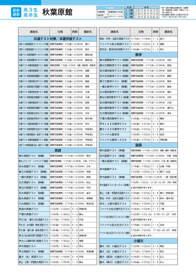 時限時間1・2限3・4限5・6限9:00〜10:30・10:50〜12:2013:20〜14:50・15:10〜16:4017:00〜18:30・18:50〜20:20▶同一名称の講座は設置校舎・設置期間・授業時間(時限)が異なっても同一内容です。▶担当講師は変更になる場合がありますので、あらかじめご了承ください。高3生高卒生直前講習対面授業受講開始の4日前2024/2/11(日・祝)申込期限映像授業・オンライン授業秋葉原館講座名日程時限講師名講座名日程時限講師名刈谷岡田西浦藤野共通テスト対策/本番突破テスト共通テスト本番突破英語テスト(リーディング)映像)視聴可能期間:1/5(金)〜2/29(木)共通テスト本番突破英語テスト(リスニング)映像)視聴可能期間:1/5(金)〜2/29(木)清川安井共通テスト本番突破数学ⅠAテスト(映像)視聴可能期間:1/5(金)〜2/29(木)高梨(由)明治・中央・法政大英語テスト1/17(水)・1/18(木)1・2成川ファイナル私大英語テスト1/22(月)・1/23(火)3・4濱崎英文法・語法完全攻略テスト1/26(金)・1/27(土)1・2成川数学共通テスト本番突破数学ⅡBテスト(映像)視聴可能期間:1/5(金)〜2/29(木)高梨(由)東大理類数学テスト(映像)視聴可能期間:1/17(水)〜2/29(木)共通テスト本番突破国語テスト(映像)視聴可能期間:1/5(金)〜2/29(木)松藤・阿部(順)・伊藤(恭)東大文類数学テスト(映像)視聴可能期間:1/17(水)〜2/29(木)共通テスト本番突破物理テスト(映像)視聴可能期間:1/5(金)〜2/29(木)共通テスト本番突破物理基礎テスト(映像)視聴可能期間:1/5(金)〜2/29(木)共通テスト本番突破化学テスト(映像)視聴可能期間:1/5(金)〜2/29(木)共通テスト本番突破化学基礎テスト(映像)視聴可能期間:1/5(金)〜2/29(木)共通テスト本番突破生物テスト(映像)視聴可能期間:1/5(金)〜2/29(木)共通テスト本番突破生物基礎テスト(映像)視聴可能期間:1/5(金)〜2/29(木)共通テスト本番突破地学テスト(映像)視聴可能期間:1/5(金)〜2/29(木)共通テスト本番突破地学基礎テスト(映像)視聴可能期間:1/5(金)〜2/29(木)共通テスト本番突破日本史Bテスト(映像)視聴可能期間:1/5(金)〜2/29(木)加藤加藤岡島岡島三浦三浦田島前田大内京大理系数学テスト(映像)視聴可能期間:1/17(水)〜2/29(木)京大文系数学テスト(映像)視聴可能期間:1/17(水)〜2/29(木)東工大数学テスト(映像)視聴可能期間:1/17(水)〜2/29(木)香坂一橋大数学テスト(映像)視聴可能期間:1/17(水)〜2/29(木)飯田北大理系数学テスト(映像)視聴可能期間:1/17(水)〜2/29(木)東北大理系数学テスト(映像)視聴可能期間:1/17(水)〜2/29(木)名大理系数学テスト(映像)視聴可能期間:1/17(水)〜2/29(木)福井木村小田阪大理系数学テスト(映像)視聴可能期間:1/17(水)〜2/29(木)瀬戸山九大理系数学テスト(映像)視聴可能期間:1/17(水)〜2/29(木)清水共通テスト本番突破世界史Bテスト(映像)視聴可能期間:1/5(金)〜2/29(木)坂本(新)千葉大理系数学テスト1/26(金)・1/27(土)1・2郷田共通テスト本番突破地理Bテスト(映像)視聴可能期間:1/5(金)〜2/29(木)中井早大ⅠAⅡB数学テスト1/26(金)・1/27(土)3・4渡辺共通テスト本番突破現代社会テスト(映像)視聴可能期間:1/5(金)〜2/29(木)平尾(則)慶大ⅠAⅡB数学テスト1/26(金)・1/27(土)1・2渡辺共通テスト本番突破政治・経済テスト(映像)視聴可能期間:1/5(金)〜2/29(木)平尾(則)ファイナル数学Ⅲ1/22(月)・1/23(火)5・6生田共通テスト本番突破倫理テスト(映像)視聴可能期間:1/5(金)〜2/29(木)平尾(則)ファイナル数学ⅠAⅡB1/26(金)・1/27(土)3・4伊東(鋼)共通テスト本番突破倫理,政治・経済テスト(映像)視聴可能期間:1/5(金)〜2/29(木)平尾(則)国語英語東大国語テスト(映像)視聴可能期間:1/17(水)〜2/29(木)斎藤・藤澤・髙橋(佳)東大英語テスト(映像)視聴可能期間:1/17(水)〜2/29(木)高沢京大国語テスト(映像)視聴可能期間:1/17(水)〜2/29(木)中崎・松尾東大リスニングインテンシブ(映像)視聴可能期間:1/17(水)〜2/29(木)久恒・マクフィ一橋大国語テスト(映像)視聴可能期間:1/17(水)〜2/29(木)三河・園・髙橋(佳)京大英語テスト(映像)視聴可能期間:1/17(水)〜2/29(木)江本東工大英語テスト(映像)視聴可能期間:1/17(水)〜2/29(木)仲野早大国語テスト1/19(金)・1/20(土)1・2山崎・平賀1/22(月)・1/23(火)5・6菊川・太田一橋大英語テスト(映像)視聴可能期間:1/17(水)〜2/29(木)新野早大国語テスト(映像)視聴可能期間:1/17(水)〜2/29(木)一瀬・阿部(順)北大英語テスト(映像)視聴可能期間:1/17(水)〜2/29(木)松山東北大英語テスト(映像)視聴可能期間:1/17(水)〜2/29(木)竹内早大国語テスト(オンライン授業)1/22(月)・1/23(火)13:20〜16:40*木村・隼坂!途中休憩があります。名大英語テスト(映像)視聴可能期間:1/17(水)〜2/29(木)金井青山・立教・学習院大国語テスト1/26(金)・1/27(土)3・4菊川・阿部(誠)阪大英語テスト(映像)九大英語テスト(映像)筑波大英語テスト千葉大英語テスト視聴可能期間:1/17(水)〜2/29(木)胡摩﨑明治・中央・法政大国語テスト1/22(月)・1/23(火)3・4鈴木・酒井(完)視聴可能期間:1/17(水)〜2/29(木)柴田(祐)早大・上智大漢文テスト1/24(水)・1/25(木)3・4打越1/22(月)・1/23(火)3・4髙橋(保)ファイナル私大現代文テスト1/24(水)・1/25(木)1・2一瀬1/29(月)・1/30(火)1・2横山早大(法)・慶大(法)英語テスト1/17(水)・1/18(木)1・2丹羽ファイナル