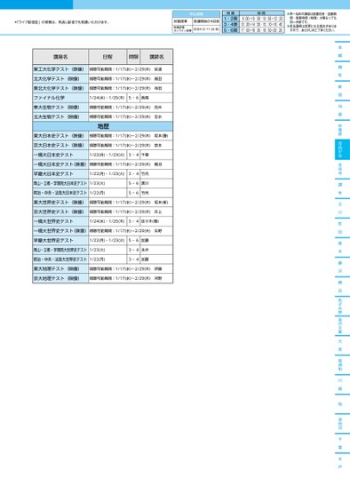 ▶同一名称の講座は設置校舎・設置期間・授業時間(時限)が異なっても同一内容です。▶担当講師は変更になる場合がありますので、あらかじめご了承ください。*「ライブ配信型」の授業は、見逃し配信でも受講いただけます。対面授業受講開始の4日前2024/2/11(日・祝)申込期限映像授業・オンライン授業時限時間1・2限3・4限5・6限9:00〜10:30・10:50〜12:2013:20〜14:50・15:10〜16:4017:00〜18:30・18:50〜20:20本郷麹町新宿池袋秋葉原自由が丘吉祥寺調布立川町田厚木藤沢横浜あざみ野金沢文庫大宮南浦和川越柏津田沼千葉水戸講座名日程時限講師名東工大化学テスト(映像)視聴可能期間:1/17(水)〜2/29(木)安達北大化学テスト(映像)視聴可能期間:1/17(水)〜2/29(木)高田東北大化学テスト(映像)視聴可能期間:1/17(水)〜2/29(木)寺田ファイナル化学1/24(水)・1/25(木)5・6西尾東大生物テスト(映像)視聴可能期間:1/17(水)〜2/29(木)向井北大生物テスト(映像)視聴可能期間:1/17(水)〜2/29(木)志水地歴東大日本史テスト(映像)視聴可能期間:1/17(水)〜2/29(木)坂本(勝)京大日本史テスト(映像)視聴可能期間:1/17(水)〜2/29(木)宮本一橋大日本史テスト1/22(月)・1/23(火)3・4千葉一橋大日本史テスト(映像)視聴可能期間:1/17(水)〜2/29(木)梶沼早慶大日本史テスト1/22(月)・1/23(火)3・4竹内青山・立教・学習院大日本史テスト1/23(火)明治・中央・法政大日本史テスト1/22(月)5・6黒川5・6竹内東大世界史テスト(映像)視聴可能期間:1/17(水)〜2/29(木)坂本(新)京大世界史テスト(映像)視聴可能期間:1/17(水)〜2/29(木)井上一橋大世界史テスト1/24(水)・1/25(木)3・4佐々木(尊)一橋大世界史テスト(映像)視聴可能期間:1/17(水)〜2/29(木)矢野早慶大世界史テスト1/22(月)・1/23(火)5・6加藤青山・立教・学習院大世界史テスト1/23(火)明治・中央・法政大世界史テスト1/22(月)3・4永井3・4加藤東大地理テスト(映像)視聴可能期間:1/17(水)〜2/29(木)伊藤京大地理テスト(映像)視聴可能期間:1/17(水)〜2/29(木)河野2ページ●2023年度/直前講習/東日本/自由が丘/高3・卒生/パターン7043/2023_59_3_337_11_20230808105054.csv校了時削除