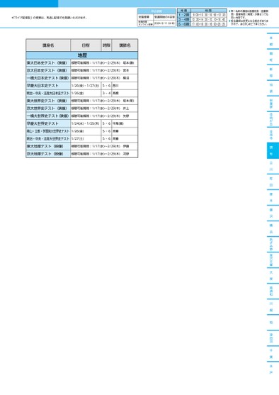 ▶同一名称の講座は設置校舎・設置期間・授業時間(時限)が異なっても同一内容です。▶担当講師は変更になる場合がありますので、あらかじめご了承ください。*「ライブ配信型」の授業は、見逃し配信でも受講いただけます。対面授業受講開始の4日前2024/2/11(日・祝)申込期限映像授業・オンライン授業時限時間1・2限3・4限5・6限9:00〜10:30・10:50〜12:2013:20〜14:50・15:10〜16:4017:00〜18:30・18:50〜20:20本郷麹町新宿池袋秋葉原自由が丘吉祥寺調布立川町田厚木藤沢横浜あざみ野金沢文庫大宮南浦和川越柏津田沼千葉水戸講座名日程時限講師名地歴東大日本史テスト(映像)視聴可能期間:1/17(水)〜2/29(木)坂本(勝)京大日本史テスト(映像)視聴可能期間:1/17(水)〜2/29(木)宮本一橋大日本史テスト(映像)視聴可能期間:1/17(水)〜2/29(木)梶沼早慶大日本史テスト1/26(金)・1/27(土)5・6西川明治・中央・法政大日本史テスト1/26(金)3・4髙橋東大世界史テスト(映像)視聴可能期間:1/17(水)〜2/29(木)坂本(新)京大世界史テスト(映像)視聴可能期間:1/17(水)〜2/29(木)井上一橋大世界史テスト(映像)視聴可能期間:1/17(水)〜2/29(木)矢野早慶大世界史テスト1/24(水)・1/25(木)5・6平尾(雅)青山・立教・学習院大世界史テスト1/26(金)明治・中央・法政大世界史テスト1/27(土)5・6斉藤5・6斉藤東大地理テスト(映像)視聴可能期間:1/17(水)〜2/29(木)伊藤京大地理テスト(映像)視聴可能期間:1/17(水)〜2/29(木)河野2ページ●2023年度/直前講習/東日本/調布/高3・卒生/パターン7043/2023_59_3_367_11_20230808105054.csv/0高校了時削除