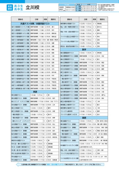 時限時間1・2限3・4限5・6限9:00〜10:30・10:50〜12:2013:20〜14:50・15:10〜16:4017:00〜18:30・18:50〜20:20▶同一名称の講座は設置校舎・設置期間・授業時間(時限)が異なっても同一内容です。▶担当講師は変更になる場合がありますので、あらかじめご了承ください。高3生高卒生直前講習対面授業受講開始の4日前2024/2/11(日・祝)申込期限映像授業・オンライン授業立川校講座名日程時限講師名講座名日程時限講師名共通テスト対策/本番突破テスト共通テスト本番突破英語テスト(リーディング)映像)視聴可能期間:1/5(金)〜2/29(木)共通テスト本番突破英語テスト(リスニング)映像)視聴可能期間:1/5(金)〜2/29(木)清川安井共通テスト本番突破数学ⅠAテスト(映像)視聴可能期間:1/5(金)〜2/29(木)高梨(由)東京理科大英語テスト1/22(月)・1/23(火)3・4伊藤(剛)青山・立教・学習院大英語テスト1/26(金)・1/27(土)5・6田中(久)明治・中央・法政大英語テスト1/24(水)・1/25(木)3・4濱崎1/26(金)・1/27(土)3・4田中(久)共通テスト本番突破数学ⅡBテスト(映像)視聴可能期間:1/5(金)〜2/29(木)高梨(由)ファイナル国公立大英語テスト1/22(月)・1/23(火)3・4村共通テスト本番突破国語テスト(映像)視聴可能期間:1/5(金)〜2/29(木)松藤・阿部(順)・伊藤(恭)共通テスト本番突破物理テスト(映像)視聴可能期間:1/5(金)〜2/29(木)共通テスト本番突破物理基礎テスト(映像)視聴可能期間:1/5(金)〜2/29(木)共通テスト本番突破化学テスト(映像)視聴可能期間:1/5(金)〜2/29(木)共通テスト本番突破化学基礎テスト(映像)視聴可能期間:1/5(金)〜2/29(木)共通テスト本番突破生物テスト(映像)視聴可能期間:1/5(金)〜2/29(木)共通テスト本番突破生物基礎テスト(映像)視聴可能期間:1/5(金)〜2/29(木)共通テスト本番突破地学テスト(映像)視聴可能期間:1/5(金)〜2/29(木)共通テスト本番突破地学基礎テスト(映像)視聴可能期間:1/5(金)〜2/29(木)共通テスト本番突破日本史Bテスト(映像)視聴可能期間:1/5(金)〜2/29(木)加藤加藤岡島岡島三浦三浦田島前田大内ファイナル私大英語テスト1/19(金)・1/20(土)1・2日髙1/22(月)・1/23(火)5・6幸長英文法・語法完全攻略テスト1/26(金)・1/27(土)3・4日髙数学東大理類数学テスト1/24(水)・1/25(木)3・4伊東(敦)東大理類数学テスト(映像)視聴可能期間:1/17(水)〜2/29(木)刈谷東大文類数学テスト1/26(金)・1/27(土)3・4相川東大文類数学テスト(映像)視聴可能期間:1/17(水)〜2/29(木)京大理系数学テスト(映像)視聴可能期間:1/17(水)〜2/29(木)京大文系数学テスト(映像)視聴可能期間:1/17(水)〜2/29(木)岡田西浦藤野共通テスト本番突破世界史Bテスト(映像)視聴可能期間:1/5(金)〜2/29(木)坂本(新)東工大数学テスト1/29(月)・1/30(火)3・4麻生共通テスト本番突破地理Bテスト(映像)視聴可能期間:1/5(金)〜2/29(木)中井東工大数学テスト(映像)視聴可能期間:1/17(水)〜2/29(木)香坂共通テスト本番突破現代社会テスト(映像)視聴可能期間:1/5(金)〜2/29(木)平尾(則)一橋大数学テスト1/26(金)・1/27(土)5・6長野共通テスト本番突破政治・経済テスト(映像)視聴可能期間:1/5(金)〜2/29(木)平尾(則)一橋大数学テスト(映像)視聴可能期間:1/17(水)〜2/29(木)飯田共通テスト本番突破倫理テスト(映像)視聴可能期間:1/5(金)〜2/29(木)平尾(則)北大理系数学テスト(映像)視聴可能期間:1/17(水)〜2/29(木)共通テスト本番突破倫理,政治・経済テスト(映像)視聴可能期間:1/5(金)〜2/29(木)平尾(則)東北大理系数学テスト(映像)視聴可能期間:1/17(水)〜2/29(木)英語名大理系数学テスト(映像)視聴可能期間:1/17(水)〜2/29(木)福井木村小田東大英語テスト1/26(金)・1/27(土)1・2墺阪大理系数学テスト(映像)視聴可能期間:1/17(水)〜2/29(木)瀬戸山東大英語テスト(映像)視聴可能期間:1/17(水)〜2/29(木)高沢九大理系数学テスト(映像)視聴可能期間:1/17(水)〜2/29(木)清水東大リスニングインテンシブ(映像)視聴可能期間:1/17(水)〜2/29(木)久恒・マクフィ都立大理系数学テスト1/26(金)・1/27(土)1・2一條京大英語テスト(映像)視聴可能期間:1/17(水)〜2/29(木)江本東工大英語テスト1/24(水)・1/25(木)1・2護守東京農工大数学テスト東京理科大数学テスト1/26(金)・1/27(土)1・2相川1/22(月)・1/23(火)5・6一條東工大英語テスト(映像)視聴可能期間:1/17(水)〜2/29(木)仲野ファイナル数学Ⅲ1/26(金)・1/27(土)3・4長野一橋大英語テスト1/26(金)・1/27(土)3・4森(千)ファイナル数学ⅠAⅡB1/17(水)・1/18(木)1・2流川一橋大英語テスト(映像)視聴可能期間:1/17(水)〜2/29(木)新野国語一橋大リスニングインテンシブ1/23(火)5・6森(千)・ガイ東大国語テスト1/24(水)・1/25(木)1・2手塚・酒井(完)・喜久里北大英語テスト(映像)視聴可能期間:1/17(水)〜2/29(木)松山東大国語テスト(映像)視聴可能期間:1/17(水)〜2/29(木)斎藤・藤澤・髙橋(佳)東北大英語テスト(映像)視聴可能期間:1/17(水)〜2/29(木)竹内京大国語テスト(映像)視聴可能期間:1/17(水)〜2/29(木)中崎・松尾名大英語テスト(映像)視聴可能期間:1/17(水)〜2/29(木)金井一橋大国語テスト1/24(水)・1/25(木)3・4伊藤(武)・酒井(完)・喜久里阪大英語テスト(映像)九大英語テスト(映像)視聴可能期間:1/17(水)〜2/29(木)胡摩﨑一橋大国語テスト(映像)視聴可能期間:1/17(水)〜2/