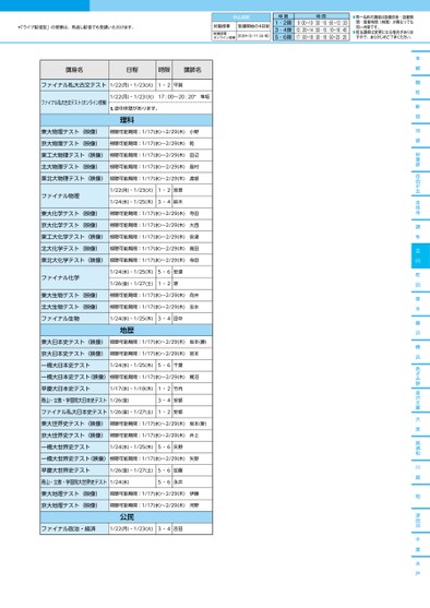 ▶同一名称の講座は設置校舎・設置期間・授業時間(時限)が異なっても同一内容です。▶担当講師は変更になる場合がありますので、あらかじめご了承ください。*「ライブ配信型」の授業は、見逃し配信でも受講いただけます。対面授業受講開始の4日前2024/2/11(日・祝)申込期限映像授業・オンライン授業時限時間1・2限3・4限5・6限9:00〜10:30・10:50〜12:2013:20〜14:50・15:10〜16:4017:00〜18:30・18:50〜20:20本郷麹町新宿池袋秋葉原自由が丘吉祥寺調布立川町田厚木藤沢横浜あざみ野金沢文庫大宮南浦和川越柏津田沼千葉水戸講座名日程時限講師名ファイナル私大古文テスト1/22(月)・1/23(火)1・2平賀ファイナル私大古文テスト(オンライン授業)1/22(月)・1/23(火)17:00〜20:20*隼坂!途中休憩があります。理科東大物理テスト(映像)視聴可能期間:1/17(水)〜2/29(木)小野京大物理テスト(映像)視聴可能期間:1/17(水)〜2/29(木)乾東工大物理テスト(映像)視聴可能期間:1/17(水)〜2/29(木)田辺北大物理テスト(映像)視聴可能期間:1/17(水)〜2/29(木)島村東北大物理テスト(映像)視聴可能期間:1/17(水)〜2/29(木)渡部ファイナル物理1/22(月)・1/23(火)1・2宮原1/24(水)・1/25(木)3・4鈴木東大化学テスト(映像)視聴可能期間:1/17(水)〜2/29(木)寺田京大化学テスト(映像)視聴可能期間:1/17(水)〜2/29(木)大西東工大化学テスト(映像)視聴可能期間:1/17(水)〜2/29(木)安達北大化学テスト(映像)視聴可能期間:1/17(水)〜2/29(木)高田東北大化学テスト(映像)視聴可能期間:1/17(水)〜2/29(木)寺田ファイナル化学1/24(水)・1/25(木)5・6安達1/26(金)・1/27(土)1・2原東大生物テスト(映像)視聴可能期間:1/17(水)〜2/29(木)向井北大生物テスト(映像)視聴可能期間:1/17(水)〜2/29(木)志水ファイナル生物1/24(水)・1/25(木)3・4田中地歴東大日本史テスト(映像)視聴可能期間:1/17(水)〜2/29(木)坂本(勝)京大日本史テスト(映像)視聴可能期間:1/17(水)〜2/29(木)宮本一橋大日本史テスト1/24(水)・1/25(木)5・6千葉一橋大日本史テスト(映像)視聴可能期間:1/17(水)〜2/29(木)梶沼早慶大日本史テスト1/17(水)・1/18(木)1・2竹内青山・立教・学習院大日本史テスト1/26(金)3・4安部ファイナル私大日本史テスト1/26(金)・1/27(土)1・2安部東大世界史テスト(映像)視聴可能期間:1/17(水)〜2/29(木)坂本(新)京大世界史テスト(映像)視聴可能期間:1/17(水)〜2/29(木)井上一橋大世界史テスト1/24(水)・1/25(木)5・6矢野一橋大世界史テスト(映像)視聴可能期間:1/17(水)〜2/29(木)矢野早慶大世界史テスト1/26(金)・1/27(土)5・6加藤青山・立教・学習院大世界史テスト1/24(水)5・6永井東大地理テスト(映像)視聴可能期間:1/17(水)〜2/29(木)伊藤京大地理テスト(映像)視聴可能期間:1/17(水)〜2/29(木)河野ファイナル政治・経済1/22(月)・1/23(火)3・4吉田公民2ページ●2023年度/直前講習/東日本/立川/高3・卒生/パターン7043/2023_59_3_315_11_20230808105054.csv/0高校了時削除