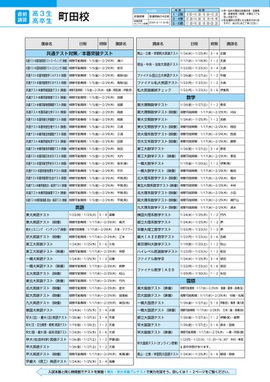 時限時間1・2限3・4限5・6限9:00〜10:30・10:50〜12:2013:20〜14:50・15:10〜16:4017:00〜18:30・18:50〜20:20▶同一名称の講座は設置校舎・設置期間・授業時間(時限)が異なっても同一内容です。▶担当講師は変更になる場合がありますので、あらかじめご了承ください。高3生高卒生直前講習対面授業受講開始の4日前2024/2/11(日・祝)申込期限映像授業・オンライン授業町田校講座名日程時限講師名講座名日程時限講師名共通テスト対策/本番突破テスト共通テスト本番突破英語テスト(リーディング)映像)視聴可能期間:1/5(金)〜2/29(木)共通テスト本番突破英語テスト(リスニング)映像)視聴可能期間:1/5(金)〜2/29(木)清川安井青山・立教・学習院大英語テスト1/24(水)・1/25(木)3・4近藤明治・中央・法政大英語テスト1/17(水)・1/18(木)1・2天倉1/22(月)・1/23(火)3・4大島共通テスト本番突破数学ⅠAテスト(映像)視聴可能期間:1/5(金)〜2/29(木)高梨(由)ファイナル国公立大英語テスト1/26(金)・1/27(土)1・2中園共通テスト本番突破数学ⅡBテスト(映像)視聴可能期間:1/5(金)〜2/29(木)高梨(由)ファイナル私大英語テスト1/22(月)・1/23(火)1・2大島共通テスト本番突破国語テスト(映像)視聴可能期間:1/5(金)〜2/29(木)松藤・阿部(順)・伊藤(恭)私大英語最終チェック1/22(月)・1/23(火)5・6伊集院共通テスト本番突破物理テスト(映像)視聴可能期間:1/5(金)〜2/29(木)共通テスト本番突破物理基礎テスト(映像)視聴可能期間:1/5(金)〜2/29(木)共通テスト本番突破化学テスト(映像)視聴可能期間:1/5(金)〜2/29(木)共通テスト本番突破化学基礎テスト(映像)視聴可能期間:1/5(金)〜2/29(木)共通テスト本番突破生物テスト(映像)視聴可能期間:1/5(金)〜2/29(木)共通テスト本番突破生物基礎テスト(映像)視聴可能期間:1/5(金)〜2/29(木)共通テスト本番突破地学テスト(映像)視聴可能期間:1/5(金)〜2/29(木)共通テスト本番突破地学基礎テスト(映像)視聴可能期間:1/5(金)〜2/29(木)共通テスト本番突破日本史Bテスト(映像)視聴可能期間:1/5(金)〜2/29(木)加藤加藤岡島岡島三浦三浦田島前田大内数学東大理類数学テスト1/26(金)・1/27(土)1・2香坂東大理類数学テスト(映像)視聴可能期間:1/17(水)〜2/29(木)刈谷東大文類数学テスト1/24(水)・1/25(木)1・2吉崎東大文類数学テスト(映像)視聴可能期間:1/17(水)〜2/29(木)京大理系数学テスト(映像)視聴可能期間:1/17(水)〜2/29(木)京大文系数学テスト(映像)視聴可能期間:1/17(水)〜2/29(木)岡田西浦藤野東工大数学テスト1/26(金)・1/27(土)3・4香坂東工大数学テスト(映像)視聴可能期間:1/17(水)〜2/29(木)香坂共通テスト本番突破世界史Bテスト(映像)視聴可能期間:1/5(金)〜2/29(木)坂本(新)一橋大数学テスト1/19(金)・1/20(土)1・2伊東(敦)共通テスト本番突破地理Bテスト(映像)視聴可能期間:1/5(金)〜2/29(木)中井一橋大数学テスト(映像)視聴可能期間:1/17(水)〜2/29(木)飯田共通テスト本番突破現代社会テスト(映像)視聴可能期間:1/5(金)〜2/29(木)平尾(則)北大理系数学テスト(映像)視聴可能期間:1/17(水)〜2/29(木)共通テスト本番突破政治・経済テスト(映像)視聴可能期間:1/5(金)〜2/29(木)平尾(則)東北大理系数学テスト(映像)視聴可能期間:1/17(水)〜2/29(木)共通テスト本番突破倫理テスト(映像)視聴可能期間:1/5(金)〜2/29(木)平尾(則)名大理系数学テスト(映像)視聴可能期間:1/17(水)〜2/29(木)福井木村小田共通テスト本番突破倫理,政治・経済テスト(映像)視聴可能期間:1/5(金)〜2/29(木)平尾(則)阪大理系数学テスト(映像)視聴可能期間:1/17(水)〜2/29(木)瀬戸山英語九大理系数学テスト(映像)視聴可能期間:1/17(水)〜2/29(木)清水東大英語テスト1/22(月)・1/23(火)3・4遠藤東大英語テスト(映像)視聴可能期間:1/17(水)〜2/29(木)高沢横国大理系数学テスト都立大理系数学テスト1/24(水)・1/25(木)1・2竹内1/24(水)・1/25(木)1・2堺東大リスニングインテンシブ(映像)視聴可能期間:1/17(水)〜2/29(木)久恒・マクフィ早慶大理工数学テスト1/22(月)・1/23(火)1・2堺京大英語テスト(映像)視聴可能期間:1/17(水)〜2/29(木)江本慶大ⅠAⅡB数学テスト1/22(月)・1/23(火)5・6吉崎東工大英語テスト1/24(水)・1/25(木)5・6久地東京理科大数学テスト1/19(金)・1/20(土)1・2秋山東工大英語テスト(映像)視聴可能期間:1/17(水)〜2/29(木)仲野ハイレベル医進数学テスト1/22(月)・1/23(火)1・2板谷一橋大英語テスト1/24(水)・1/25(木)1・2近藤ファイナル数学Ⅲ1/24(水)・1/25(木)3・4依田一橋大英語テスト(映像)視聴可能期間:1/17(水)〜2/29(木)新野北大英語テスト(映像)視聴可能期間:1/17(水)〜2/29(木)松山東北大英語テスト(映像)視聴可能期間:1/17(水)〜2/29(木)竹内ファイナル数学ⅠAⅡB1/22(月)・1/23(火)5・6依田1/29(月)・1/30(火)1・2生田国語名大英語テスト(映像)視聴可能期間:1/17(水)〜2/29(木)金井東大国語テスト(映像)視聴可能期間:1/17(水)〜2/29(木)斎藤・藤澤・髙橋(佳)阪大英語テスト(映像)九大英語テスト(映像)視聴可能期間:1/17(水)〜2/29(木)胡摩﨑京大国語テスト(映像)視聴可能期間:1/17(水)〜2/29(木)中崎・松尾視聴可能期間:1/17(水)〜2/29(木)柴田(祐)一橋大国語テスト1/26(金)・1/27(土)5・6伊藤(武)・藤澤・喜久里横国大英語テスト1/24(水)・1/25(木)3・4大胡一橋大