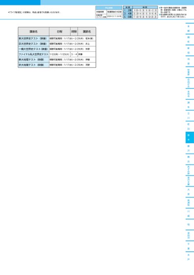 ▶同一名称の講座は設置校舎・設置期間・授業時間(時限)が異なっても同一内容です。▶担当講師は変更になる場合がありますので、あらかじめご了承ください。*「ライブ配信型」の授業は、見逃し配信でも受講いただけます。対面授業受講開始の4日前2024/2/11(日・祝)申込期限映像授業・オンライン授業時限時間1・2限3・4限5・6限9:00〜10:30・10:50〜12:2013:20〜14:50・15:10〜16:4017:00〜18:30・18:50〜20:20本郷麹町新宿池袋秋葉原自由が丘吉祥寺調布立川町田厚木藤沢横浜あざみ野金沢文庫大宮南浦和川越柏津田沼千葉水戸講座名日程時限講師名東大世界史テスト(映像)視聴可能期間:1/17(水)〜2/29(木)坂本(新)京大世界史テスト(映像)視聴可能期間:1/17(水)〜2/29(木)井上一橋大世界史テスト(映像)視聴可能期間:1/17(水)〜2/29(木)矢野ファイナル私大世界史テスト1/22(月)・1/23(火)3・4斉藤東大地理テスト(映像)視聴可能期間:1/17(水)〜2/29(木)伊藤京大地理テスト(映像)視聴可能期間:1/17(水)〜2/29(木)河野2ページ●2023年度/直前講習/東日本/厚木/高3・卒生/パターン7043/2023_59_3_332_11_20230808105054.csv/0高校了時削除